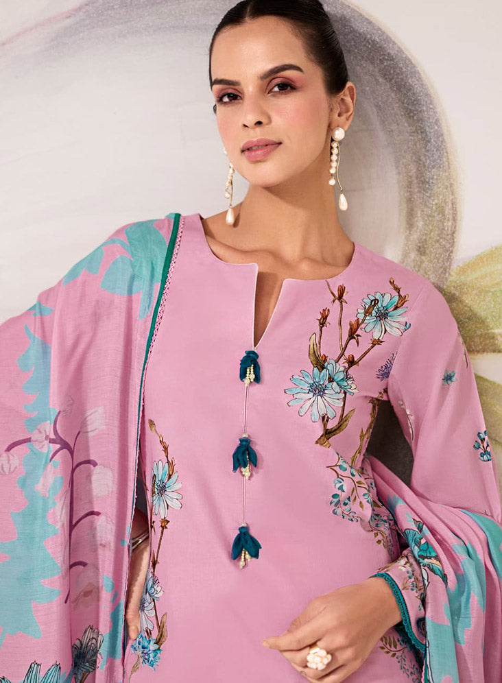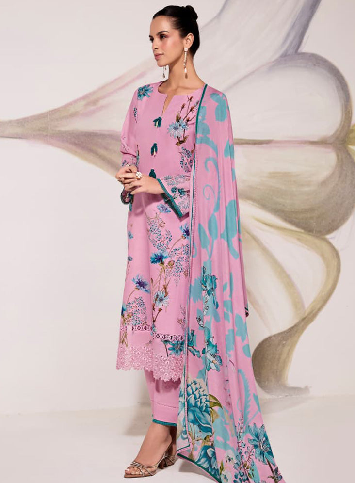 Pure Lawn Cotton Embroidered Pink Unstitched Salwar Suit for Women