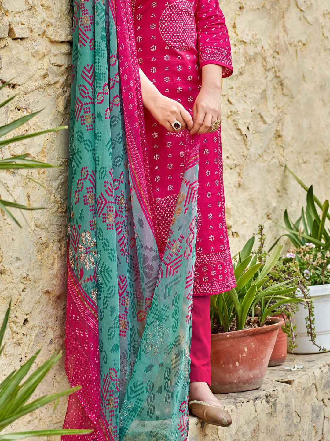 Unstitched Printed Pink Cotton Salwar Suit Dress Material for Women