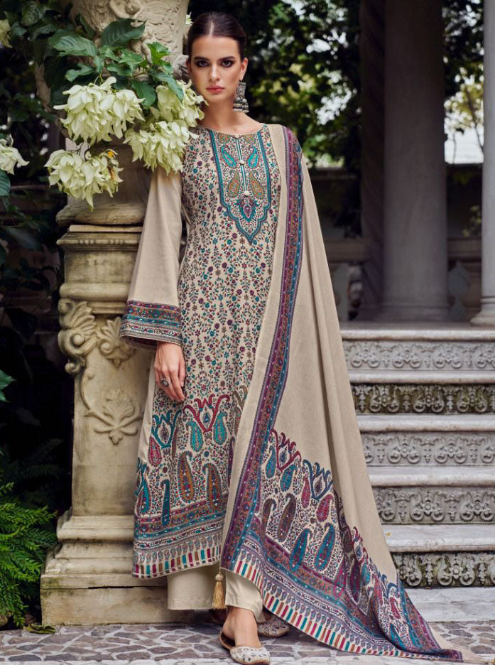 Beige Unstitched Pure Pashmina Woven Winter Suit Dress Material for Women