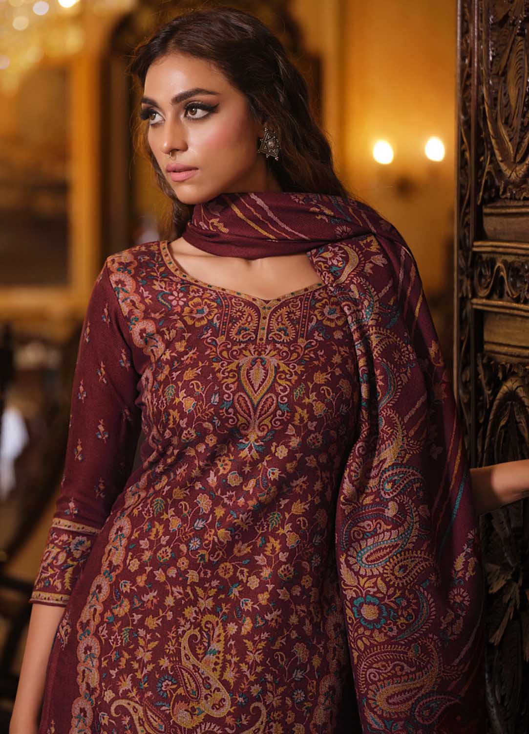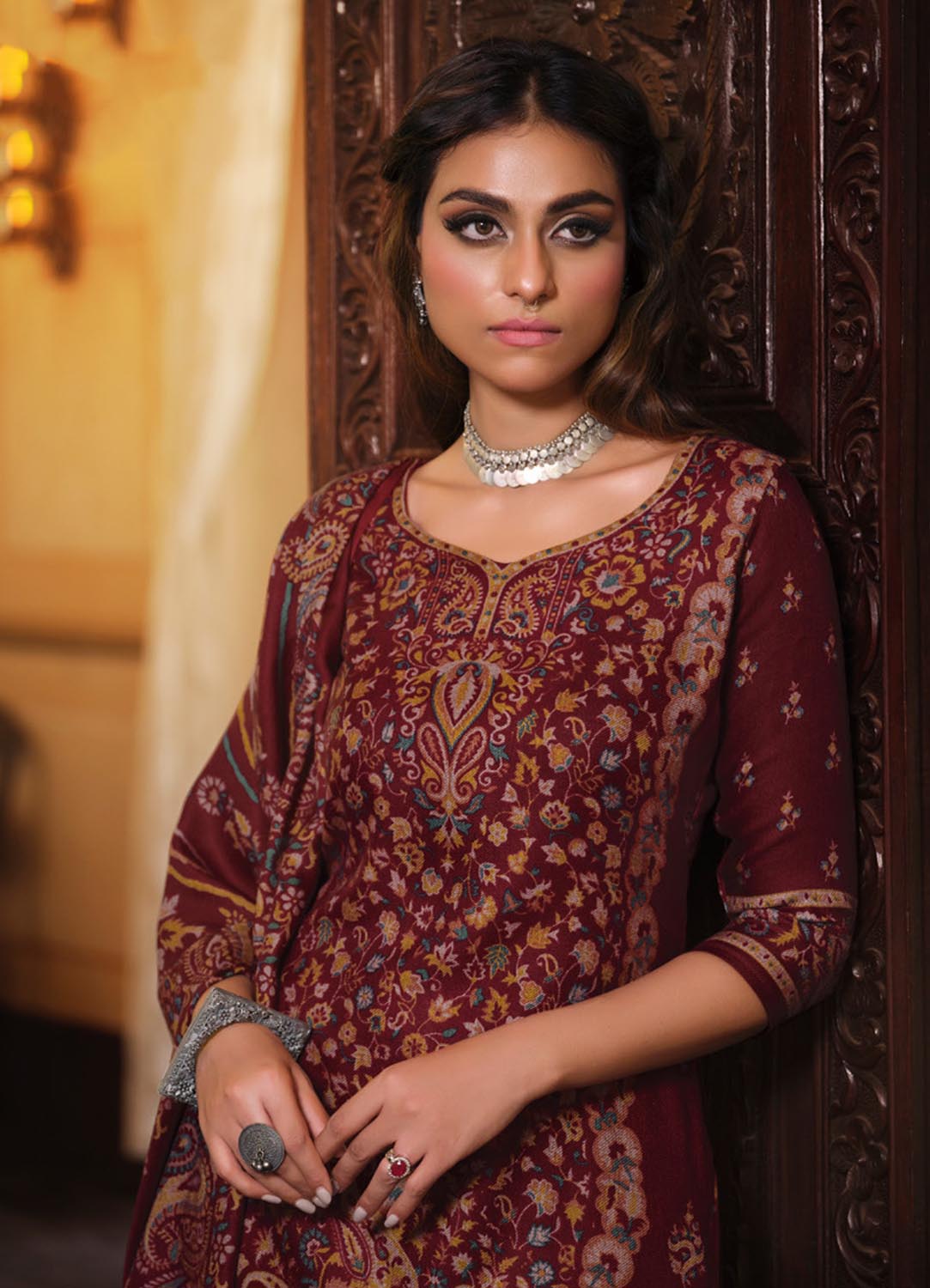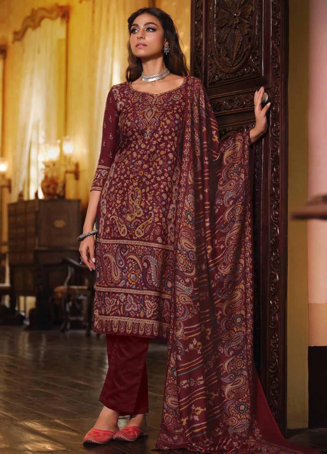 Belliza Pure Alpine Woolen Maroon Unstitched Winter Suits for Women