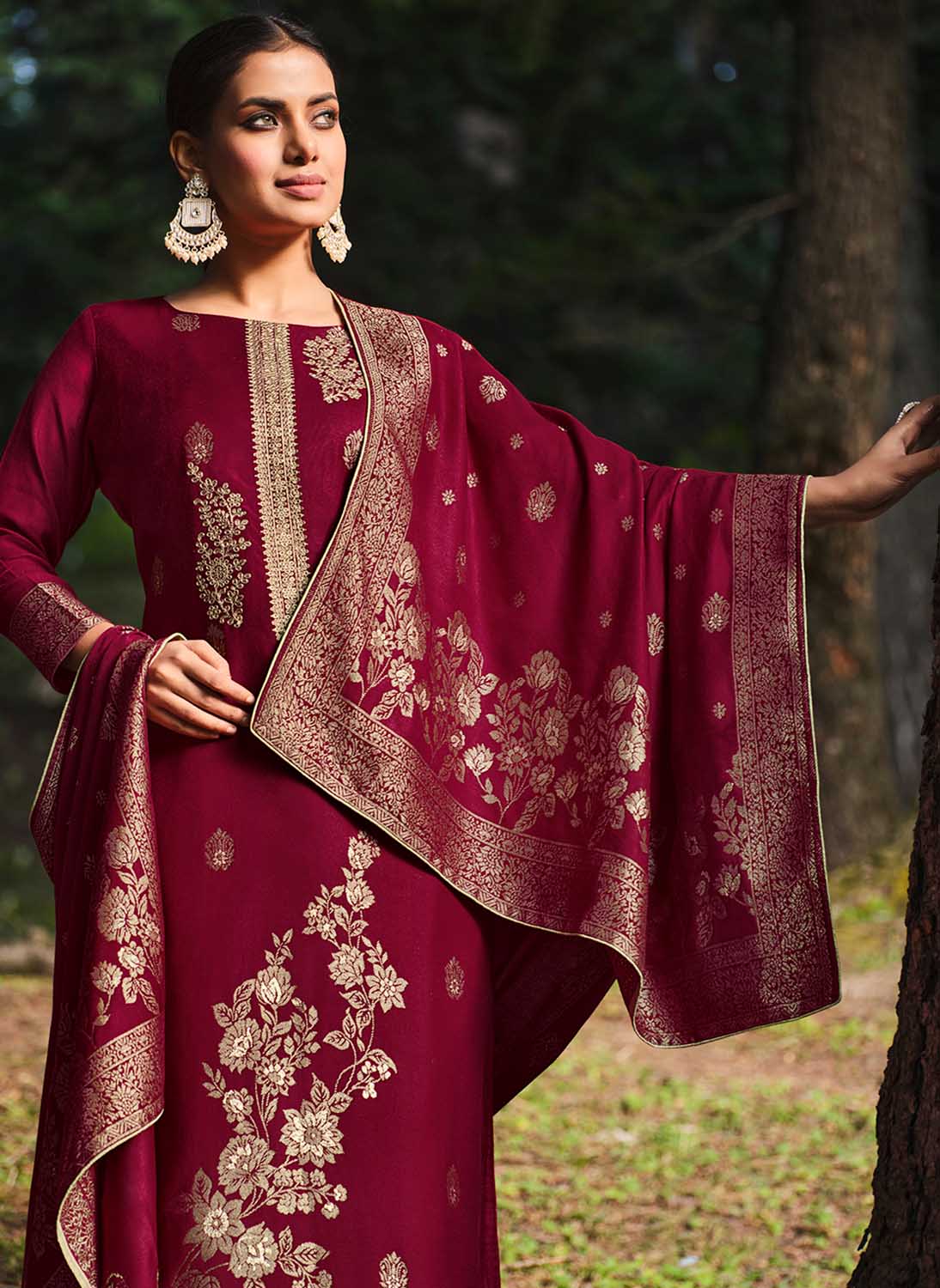 Belliza Red Pashmina Jacquard Unstitched Winter Suit Dress Material