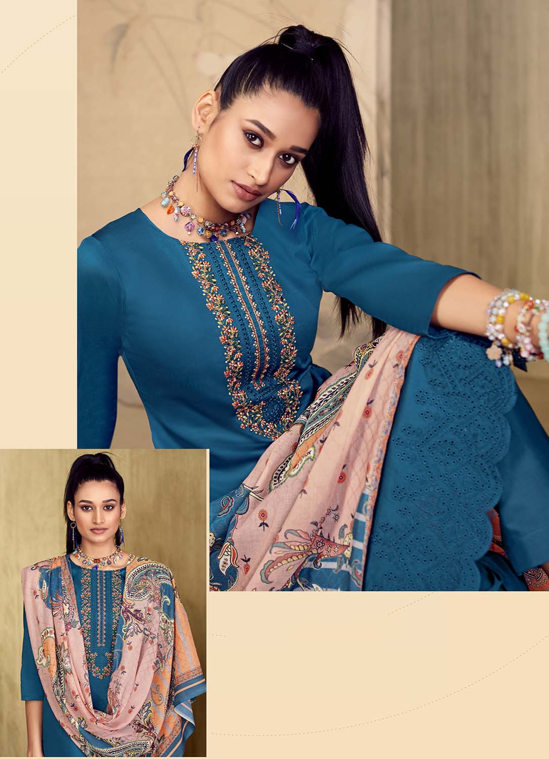 Belliza Unstitched Blue Cotton Suit Dress Material with Embroidery