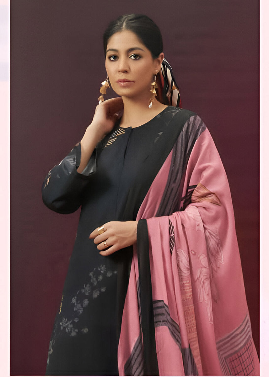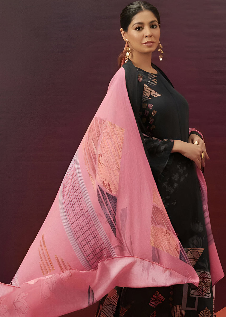 Black Printed Unstitched Cotton Satin Suit Fabric Material for Women