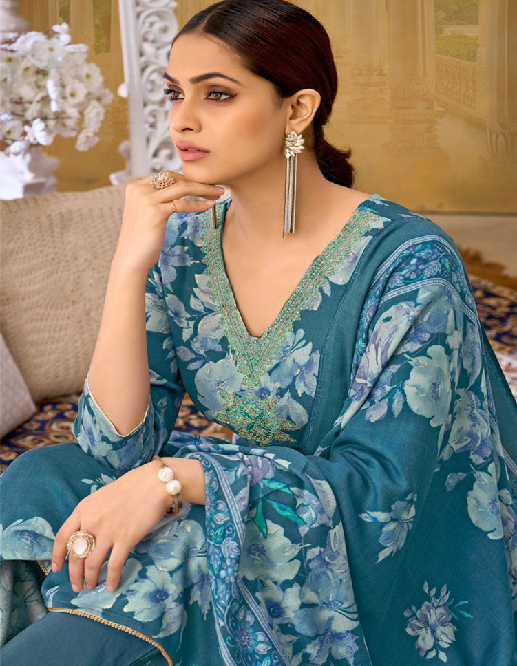 Blue Unstitched Pashmina Winter Suit Dress Material Printed with Embroidery