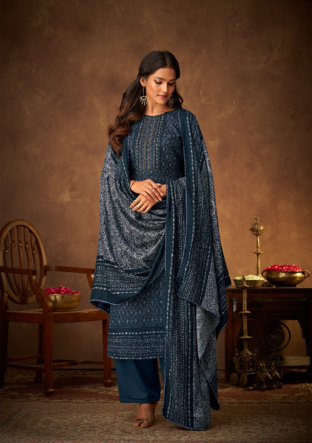 Pure Pashmina Printed Blue Winter Unstitched Salwar Suit