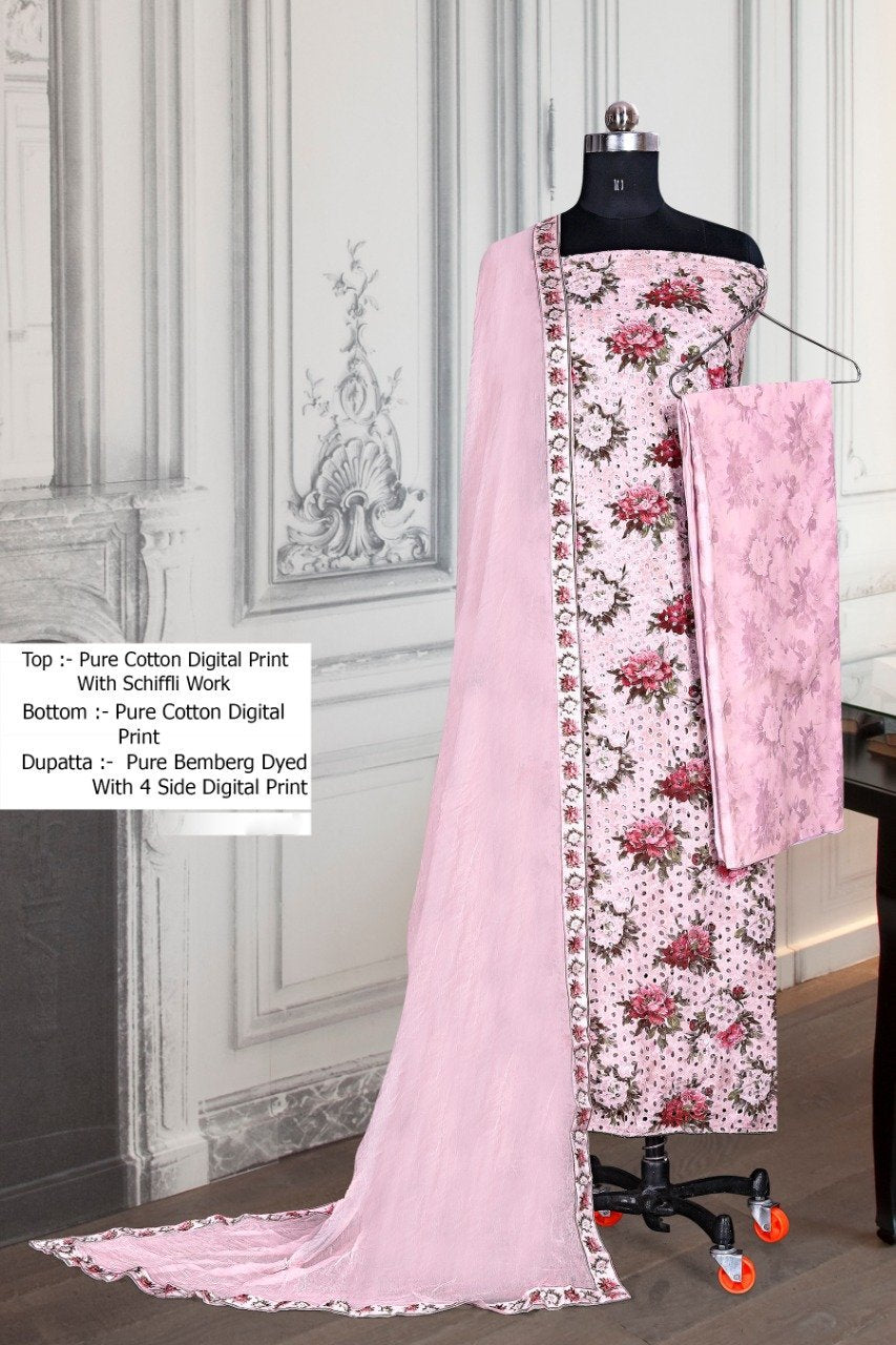 Printed Women Unstitched Pink Cotton Suit with Dupatta