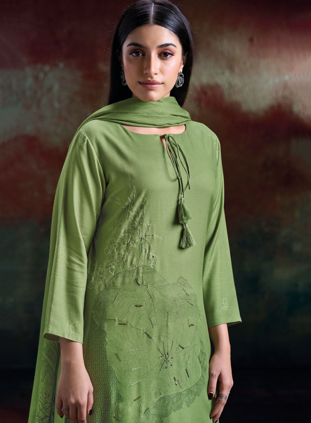 Ganga Unstitched Green Pure Pashmina Winter Suit Material for Women