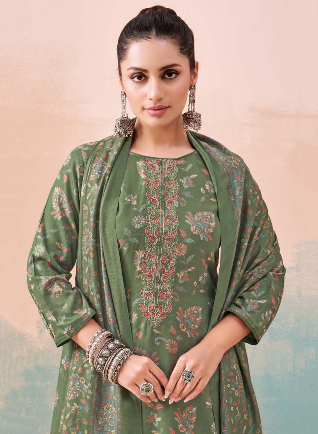 Green Pashmina Unstitched Winter Salwar Suit Material for Women