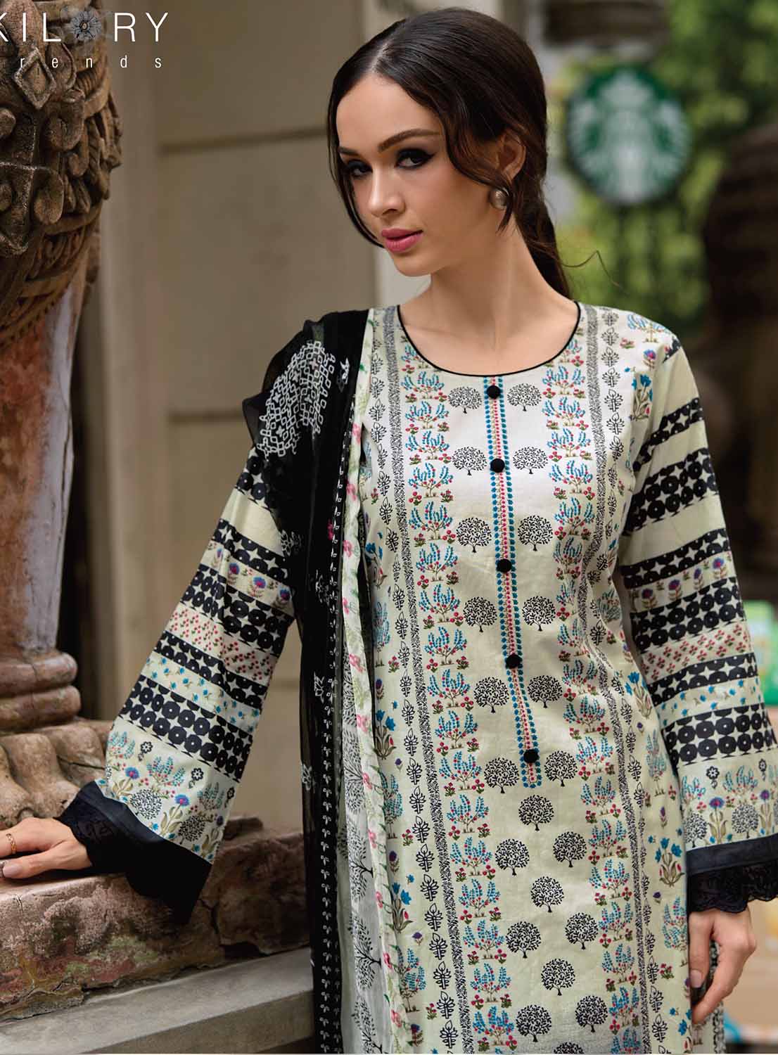 Kilory Unstitched Pure Lawn Cotton Off-White Suit Material for Women