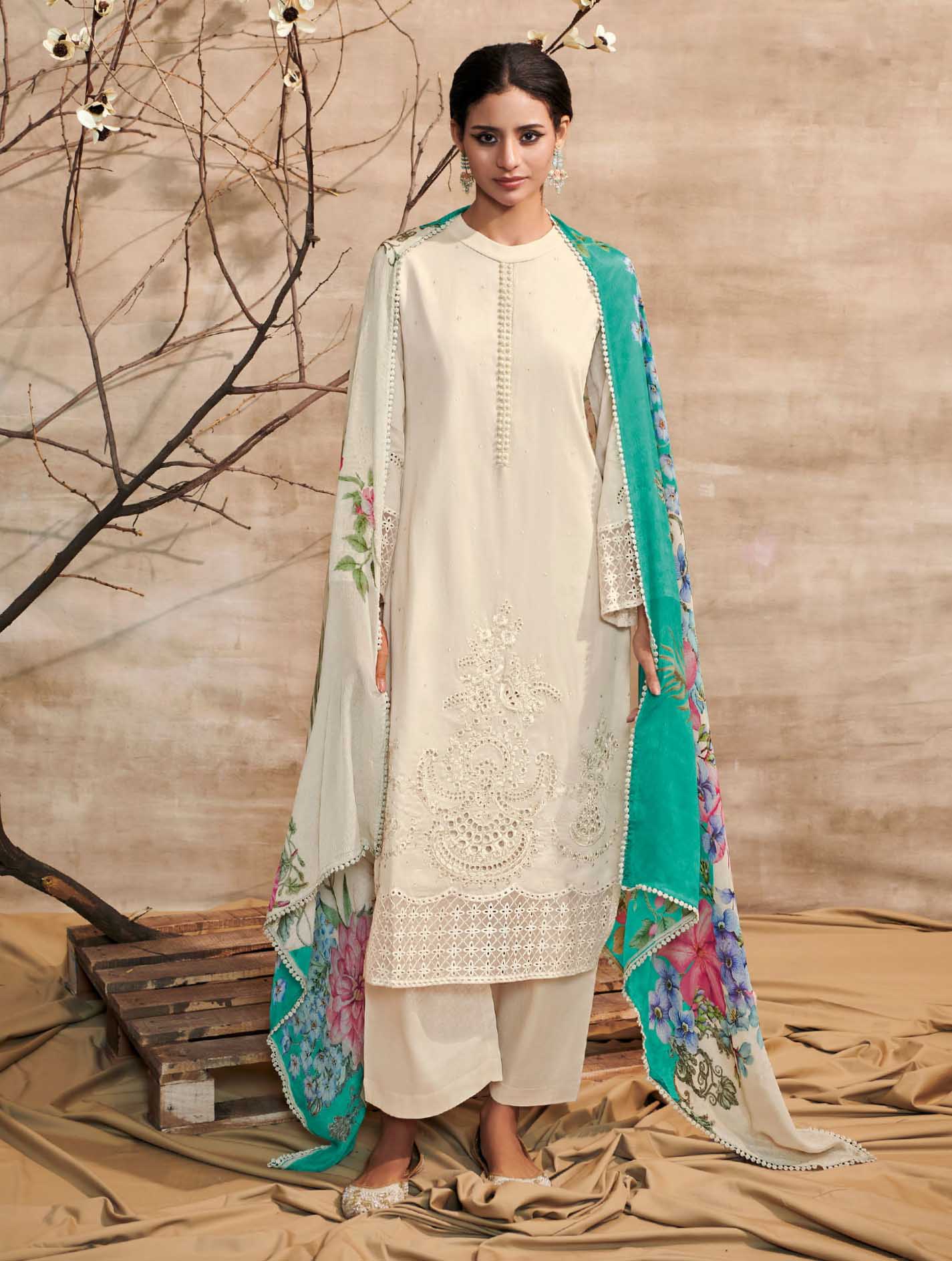 Kimora Cotton Satin Unstitched Suit Dress Material Cream