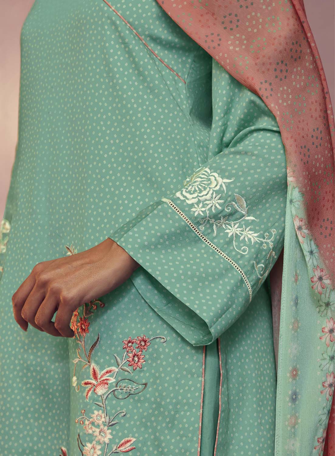 - Fabric Top: Pure Cotton Satin Bandhini Print with Parsi Embroidery on Front and Sleeves