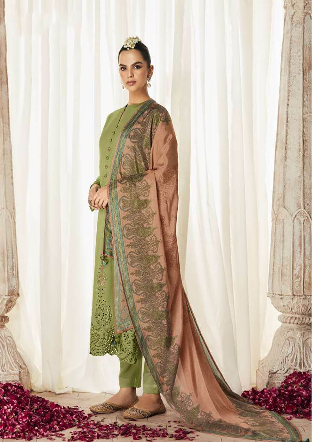 Kimora Pure Pashmina Green Winter Suit Dress Material with Embroidery