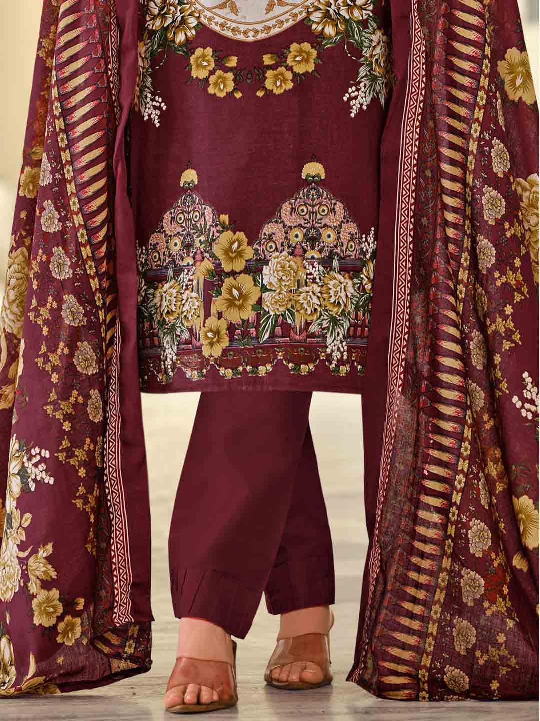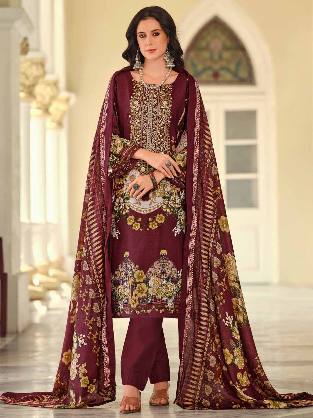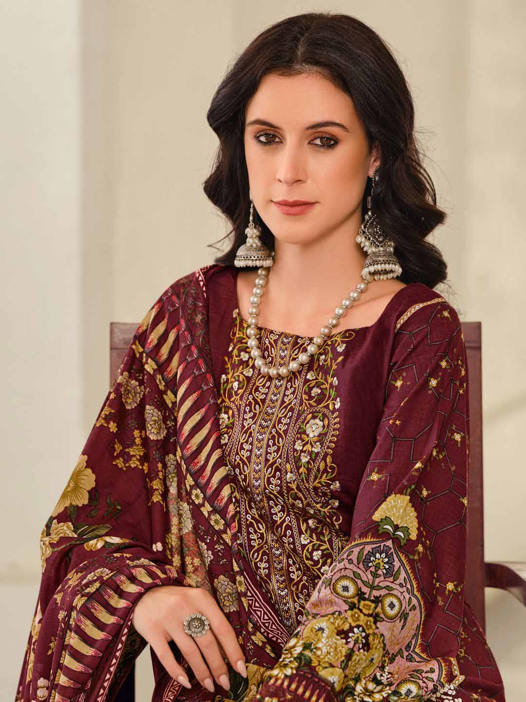 Maroon Pakistani Print Unstitched Cotton Suit Material with Embroidery