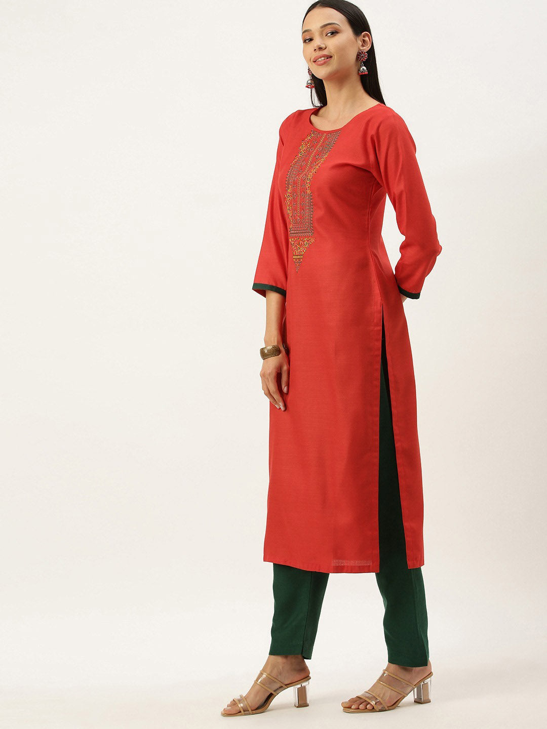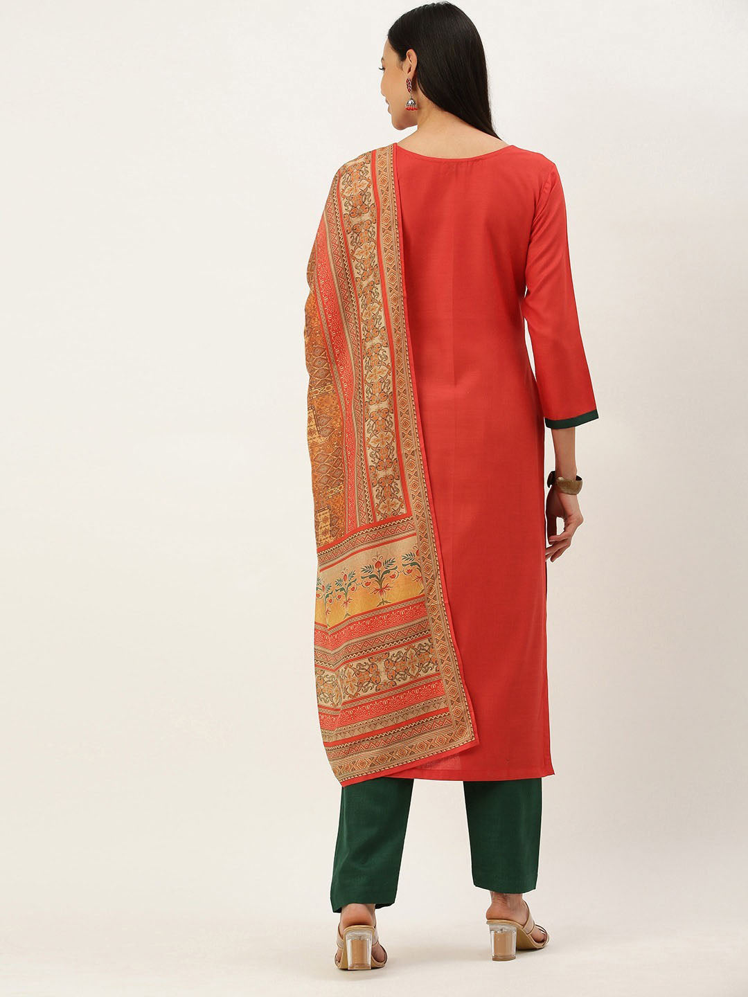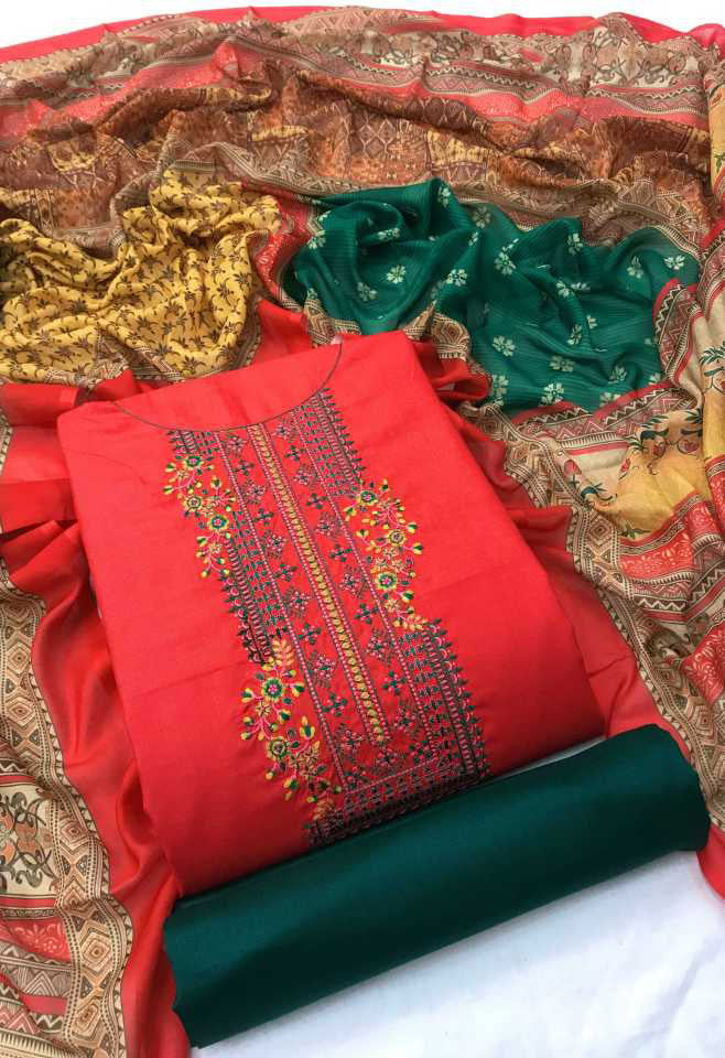 Red Unstitched Embroidered Cotton Salwar Suit Dress Material