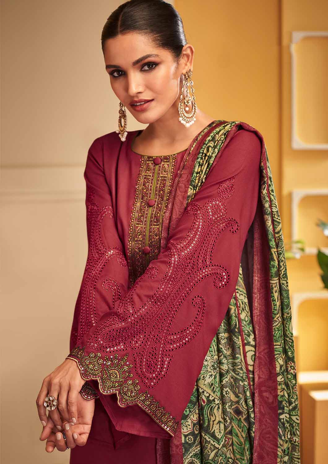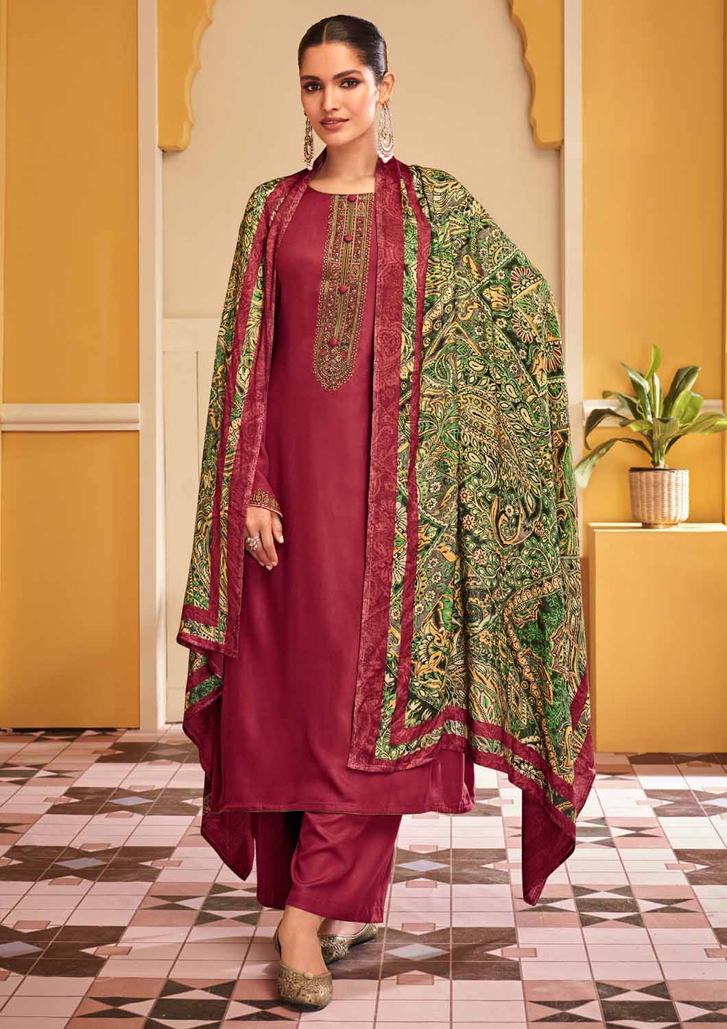 Mumtaz Arts Red Unstitched Pashmina Winter Suit with Embroidery