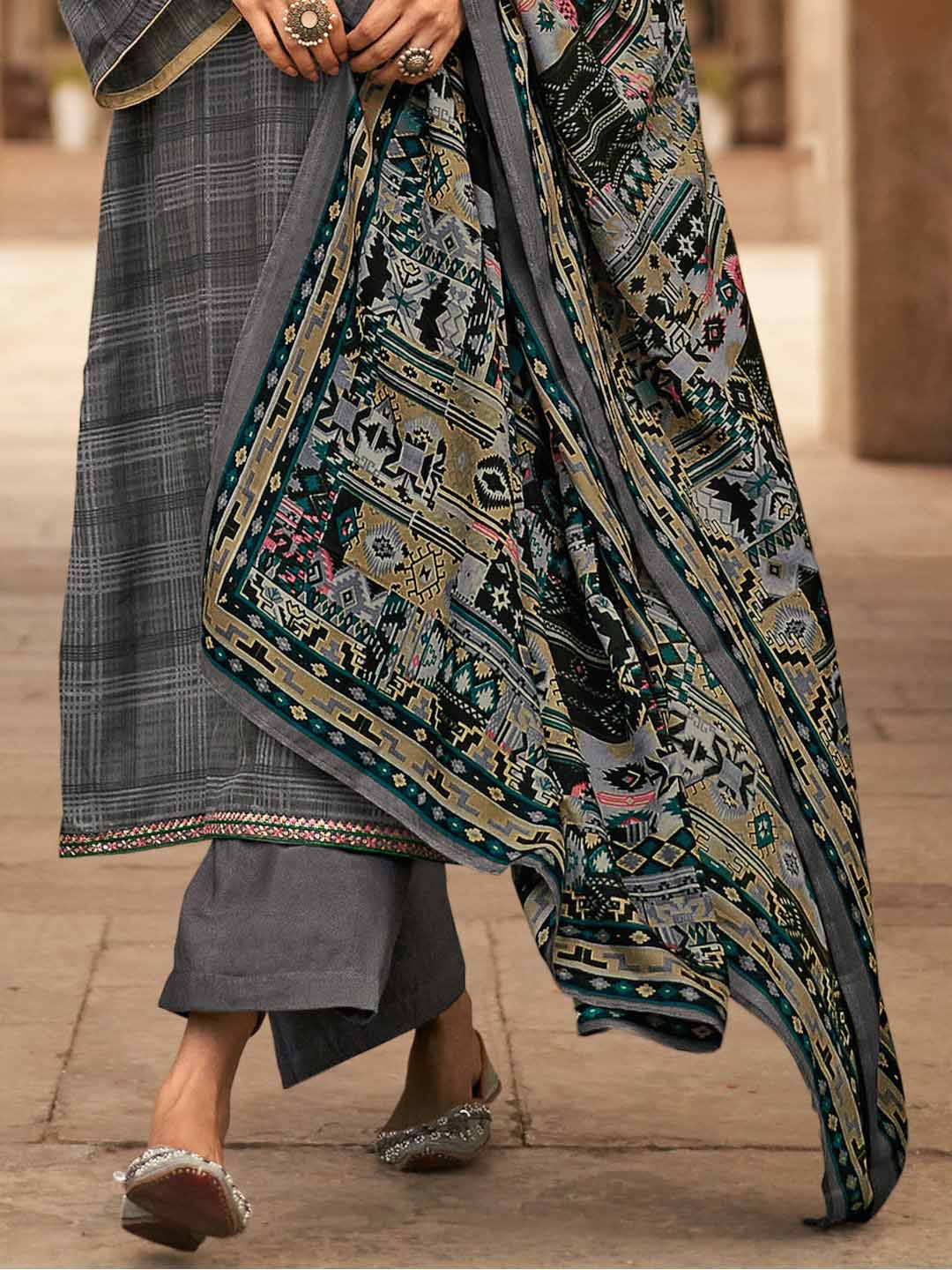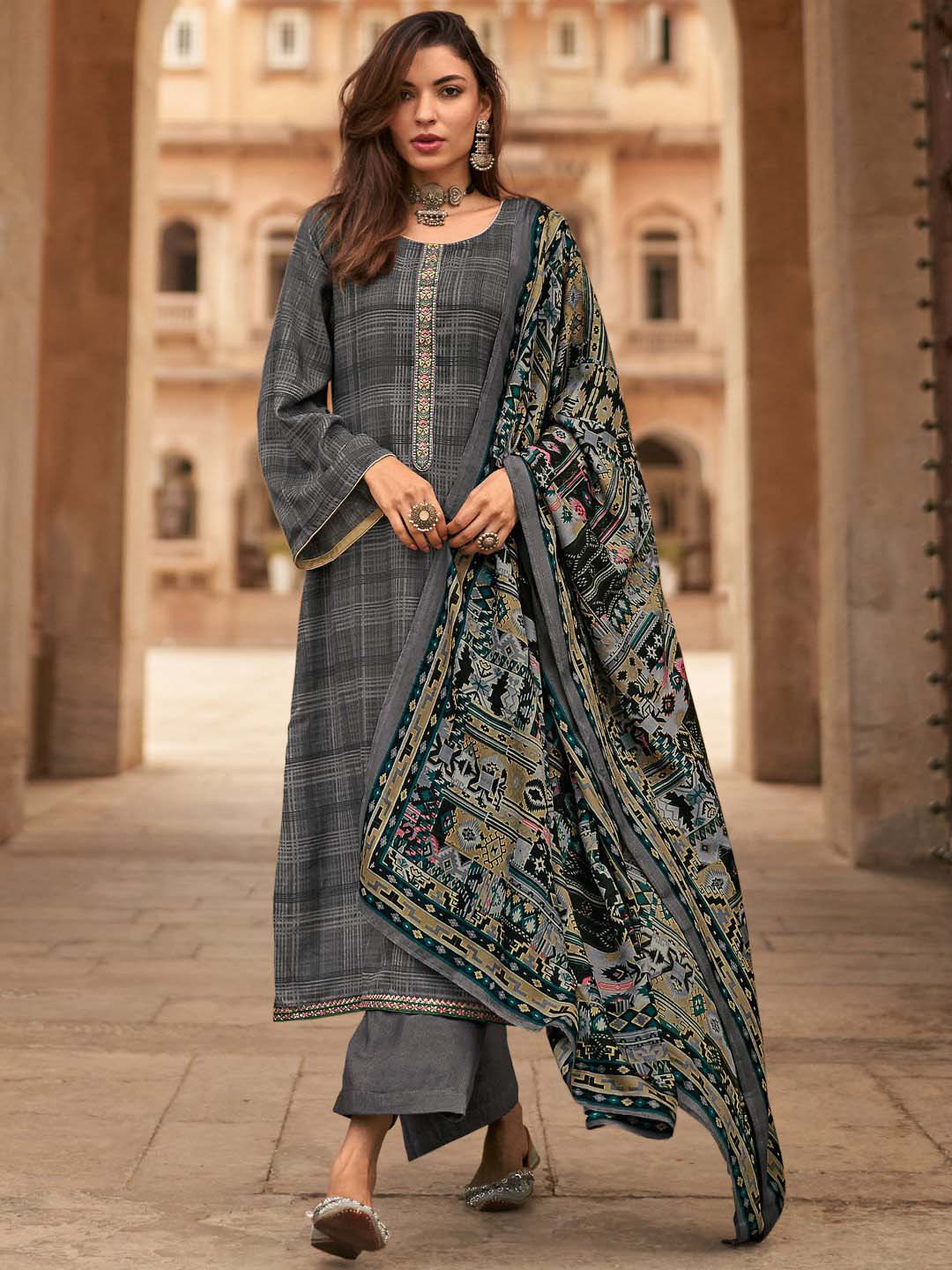 Mumtaz Arts Unstitched Grey Pashmina Winter Suit with Embroidery