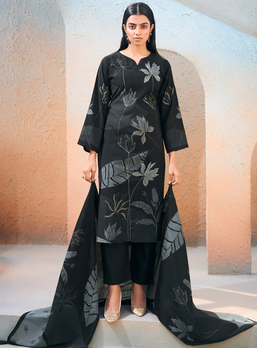 Mumtaz Arts Women's Printed Black Unstitched Muslin Salwar Suit Fabric
