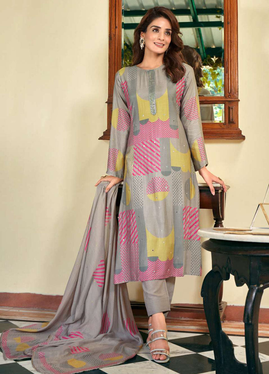 Party Wear Muslin Printed Unstitched Grey Suit Material for Women