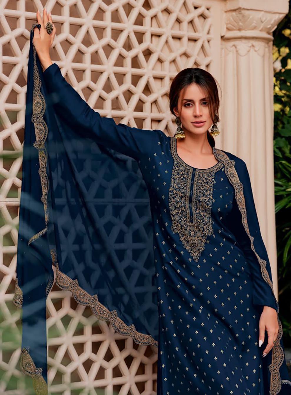 Party Wear Silk Woven Blue Unstitched Suit Material with Embroidery