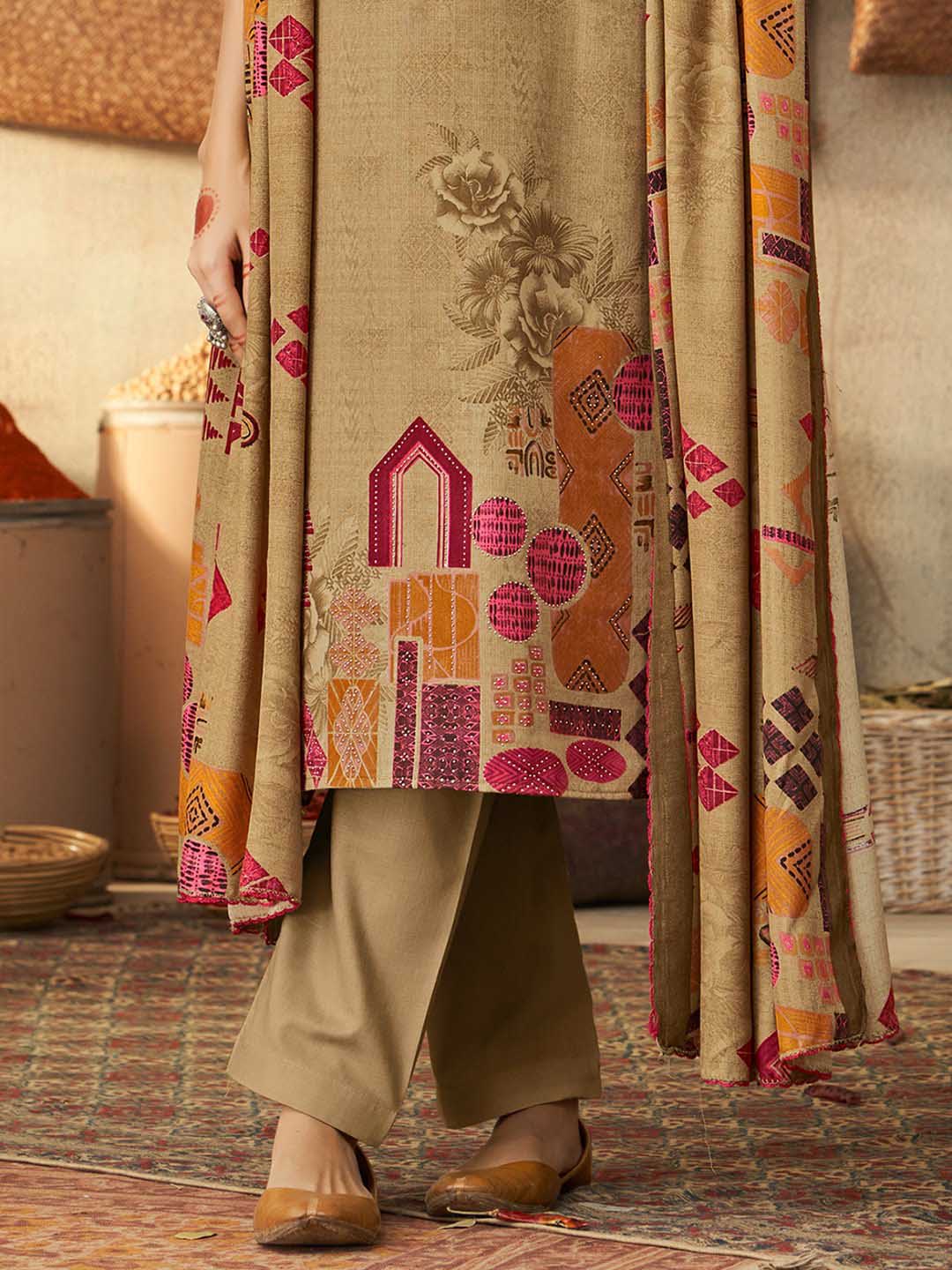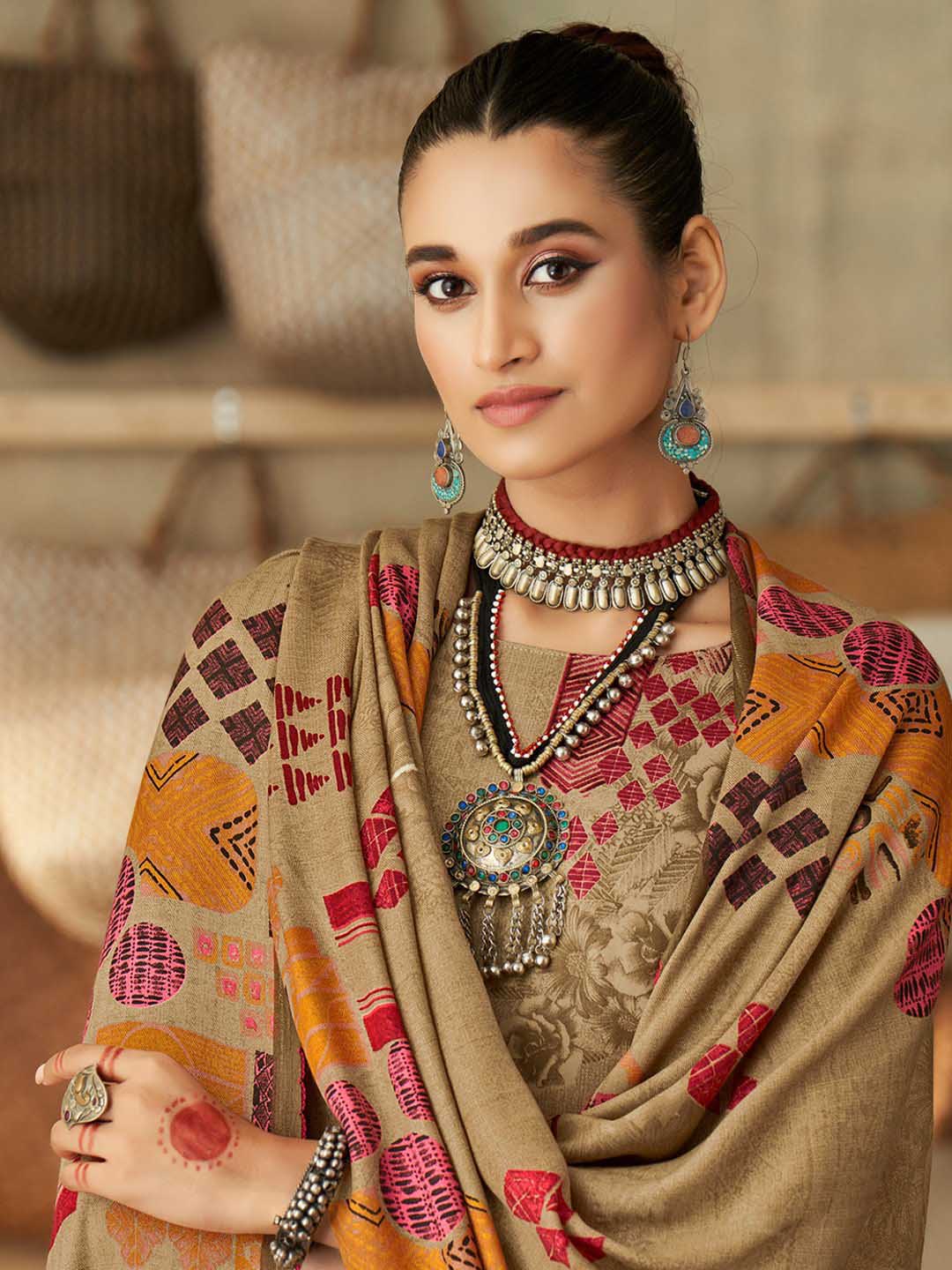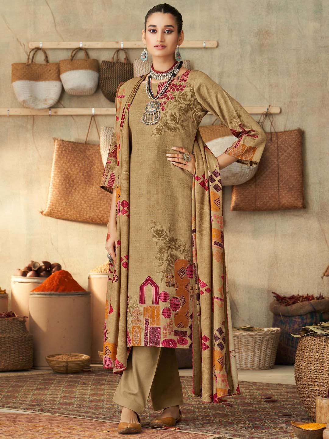 Pashmina Printed Beige Unstitched Winter Suit Material for Ladies