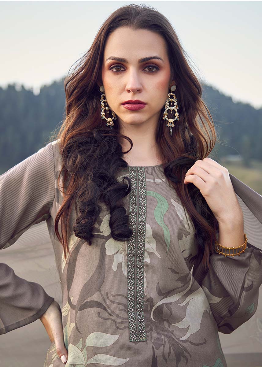 Pashmina Unstitched Grey Printed Winter Suits for Ladies
