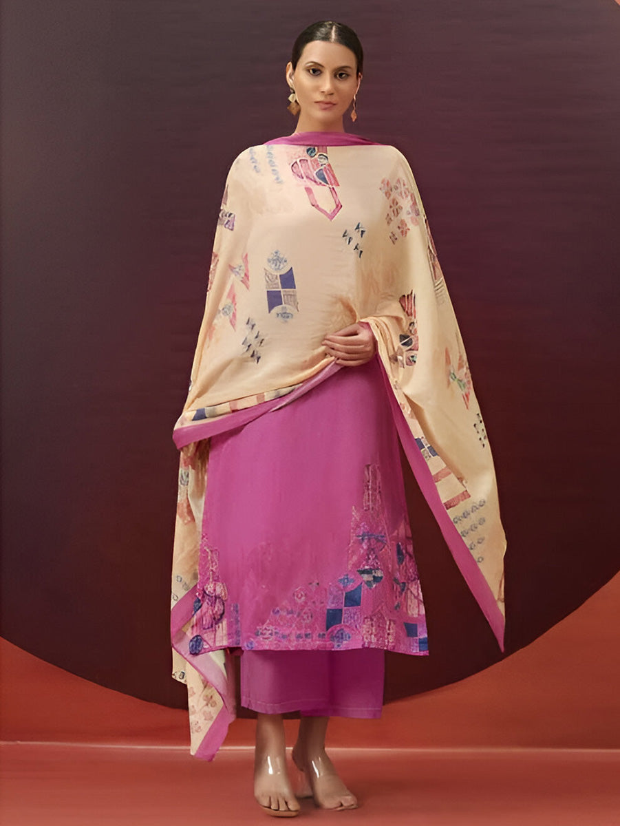Pink Printed Unstitched Cotton Satin Salwar Suit Fabric for Women