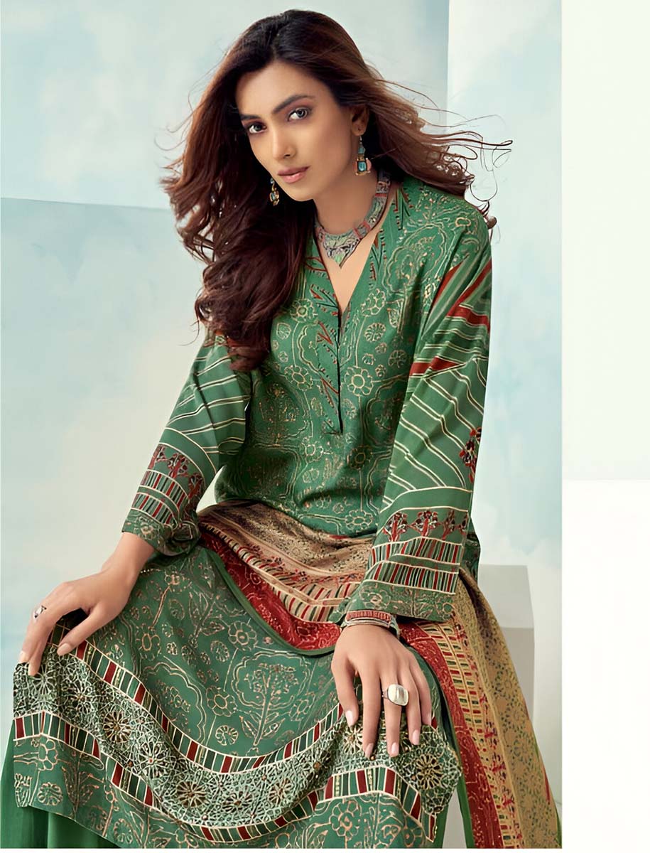 Teal Green Unstitched Printed Muslin Silk Suit Dress Material for Women