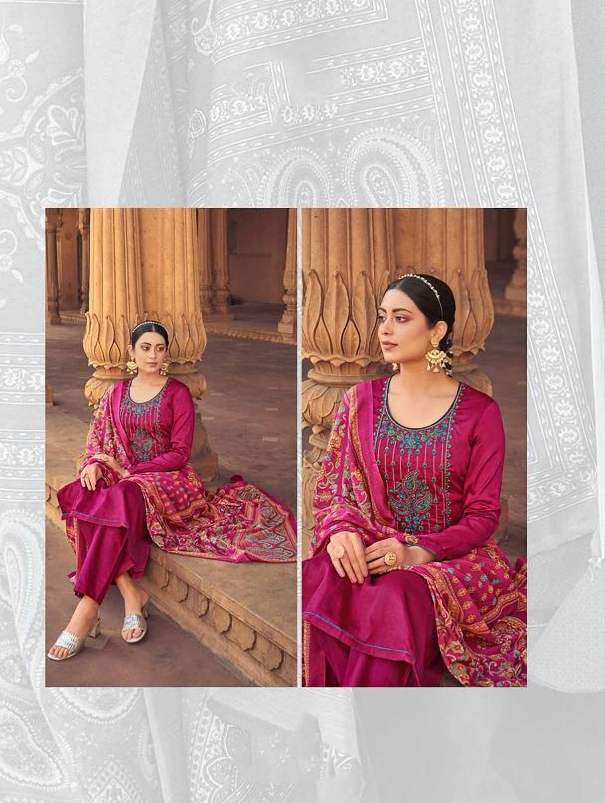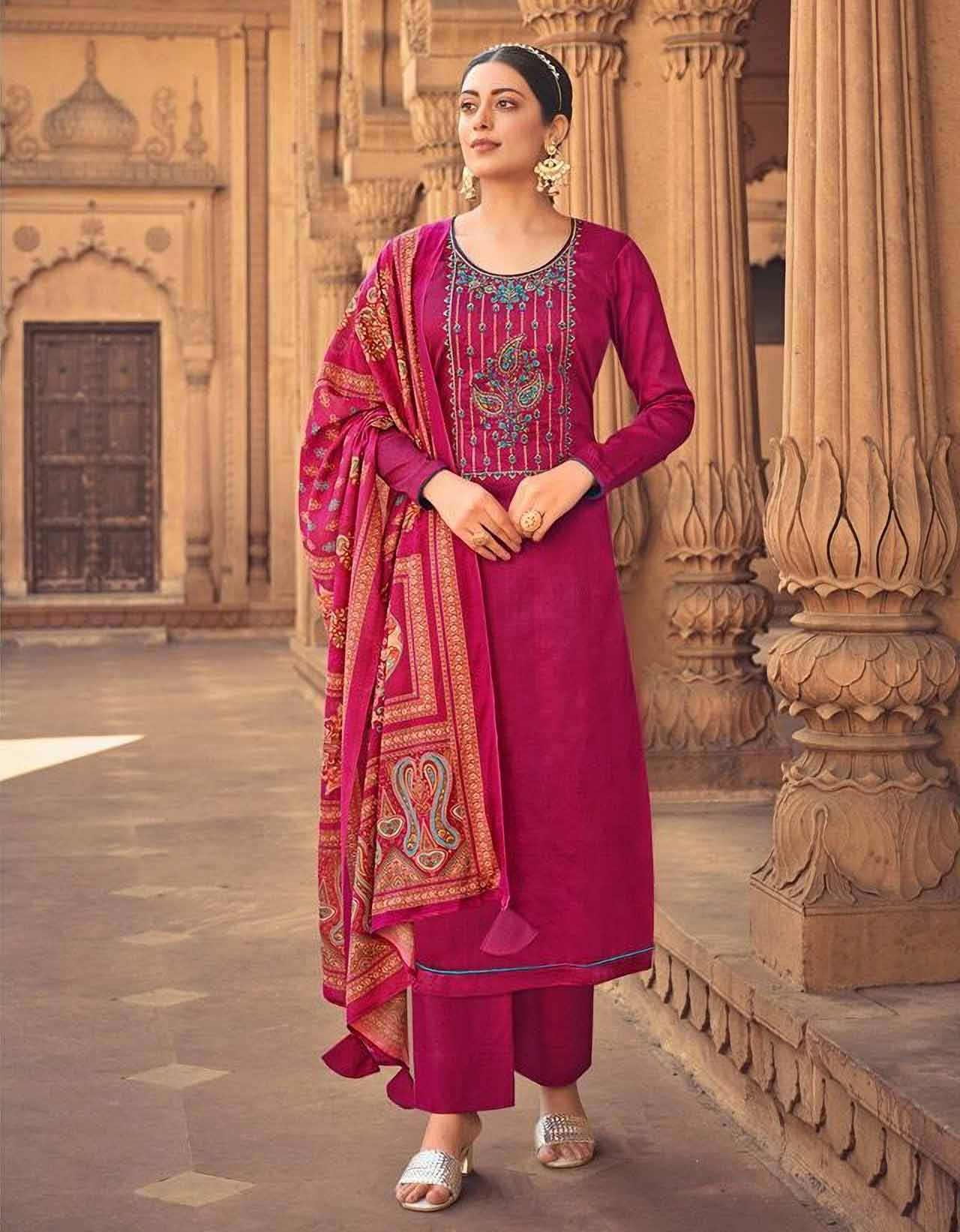 Unstitched Pink Jam Satin Printed Dress Material With Embroidery