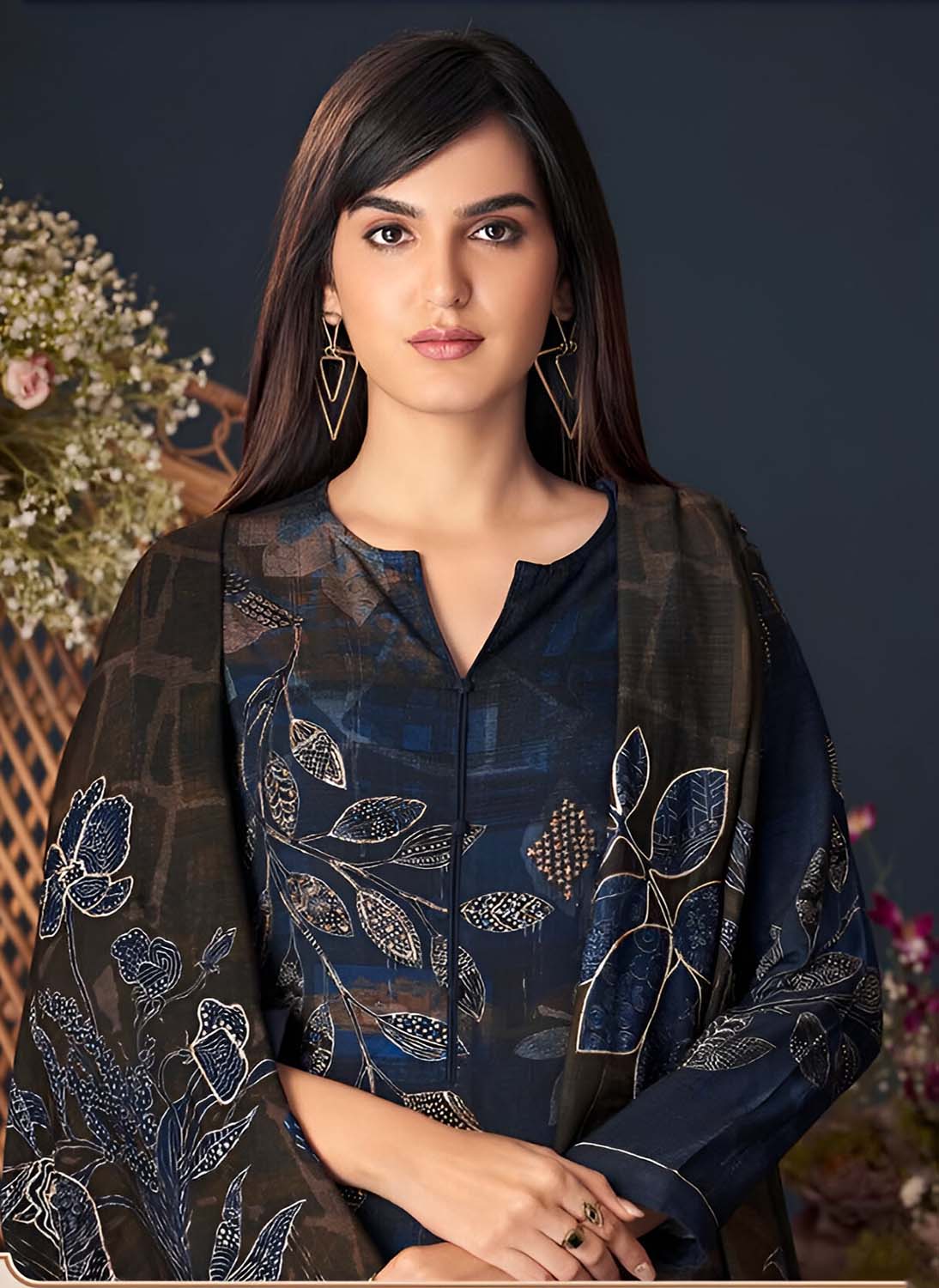 Unstitched Blue Printed Pashmina Winter Suit Dress Material for Women
