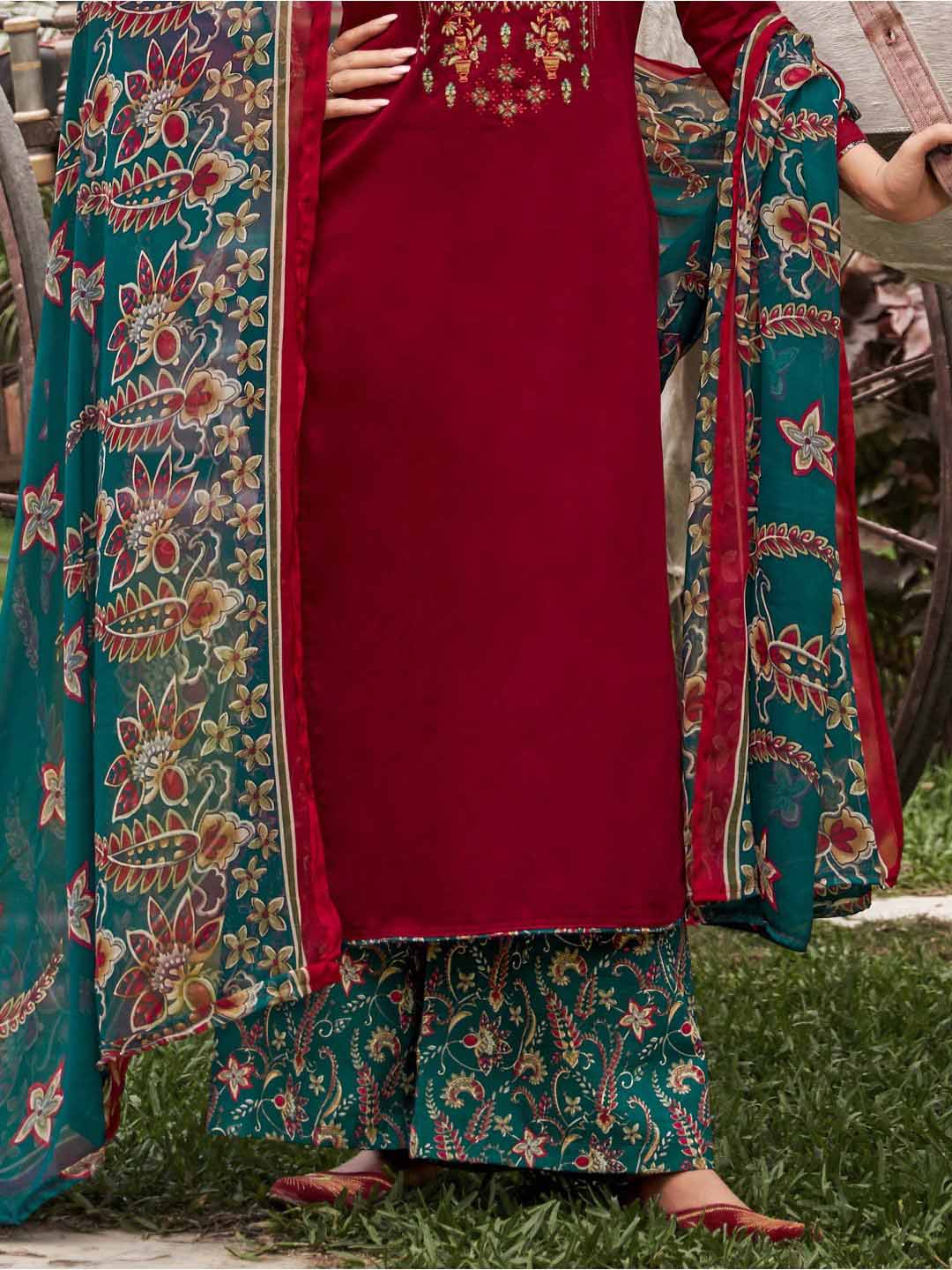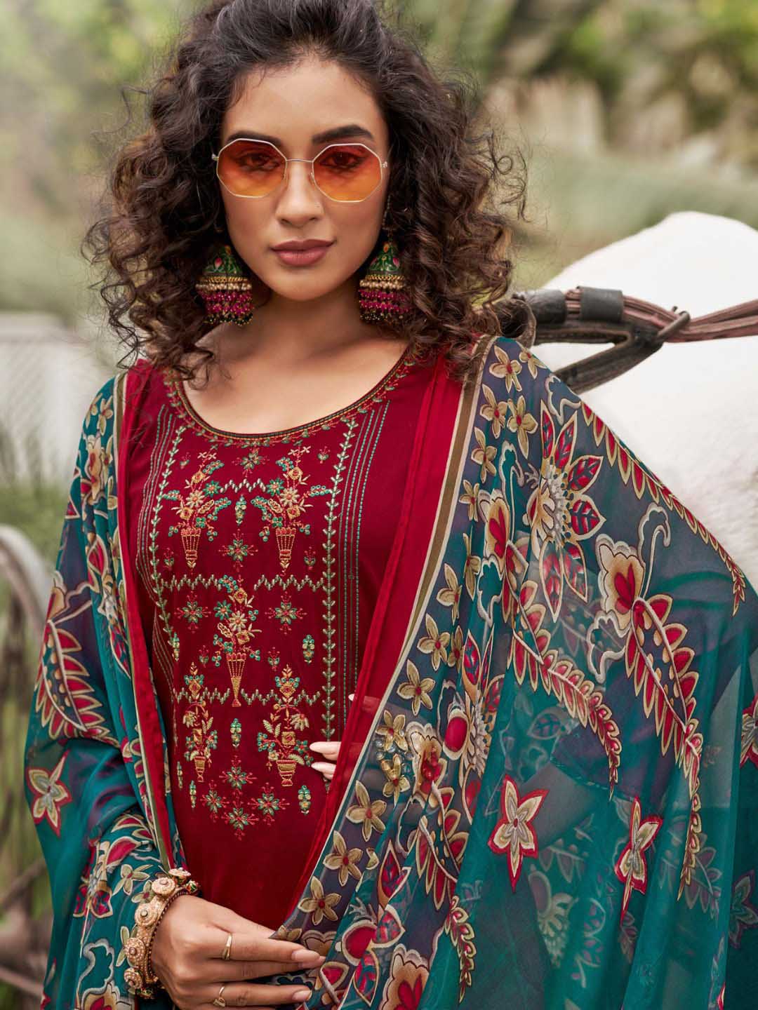 Unstitched Cotton Salwar Suit Red Dress Material with Embroidery