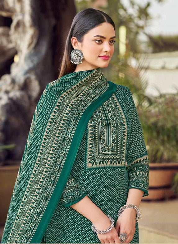 Unstitched Green Woolen Pashmina Winter Suit Dress Material for Women