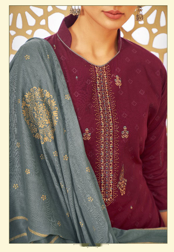 Unstitched Lawn Maroon Cotton Pant Style Suit Dress Material With Dupatta