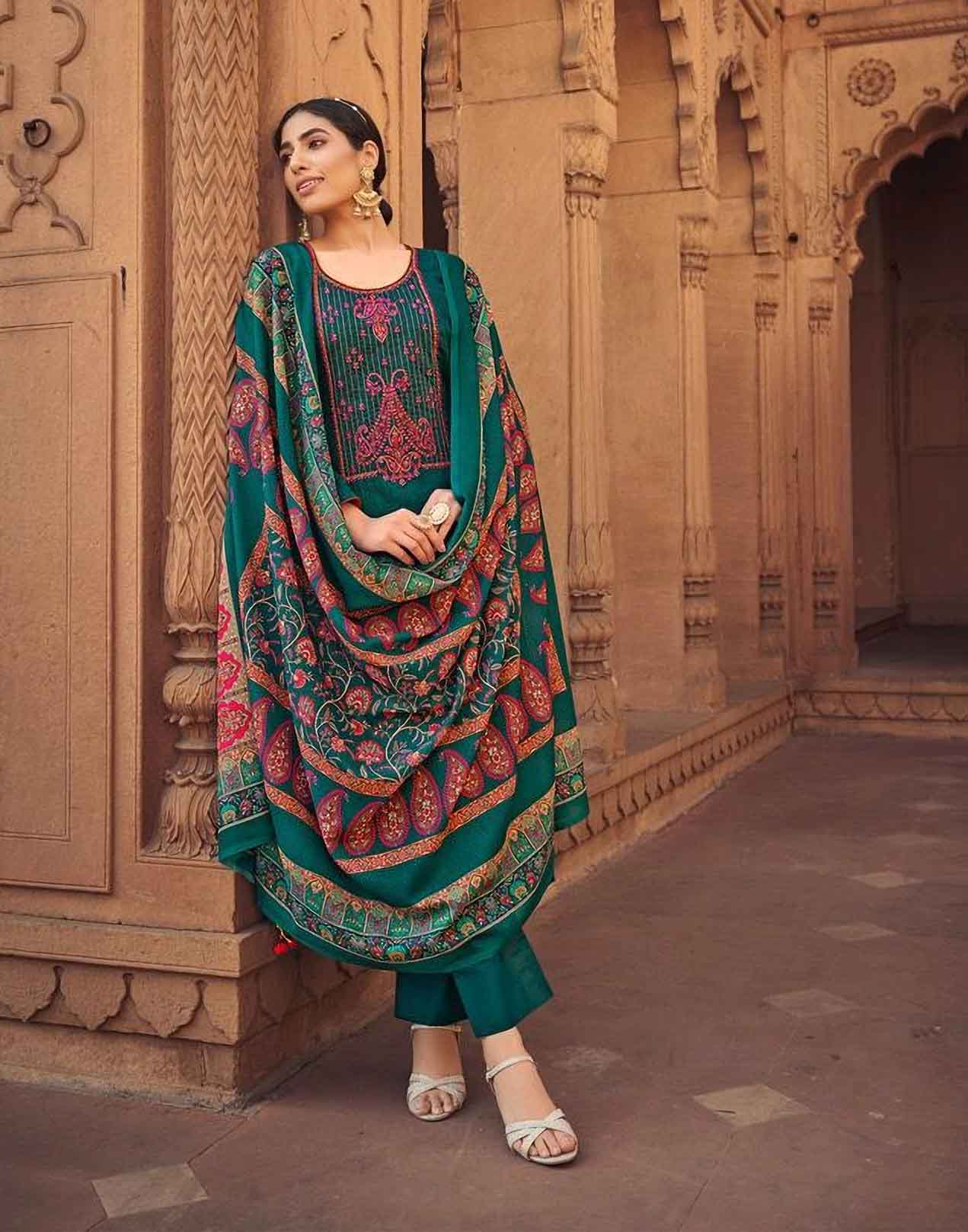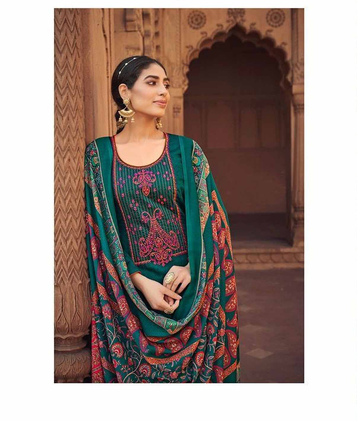 Unstitched Green Jam Satin Printed Dress Material With Embroidery