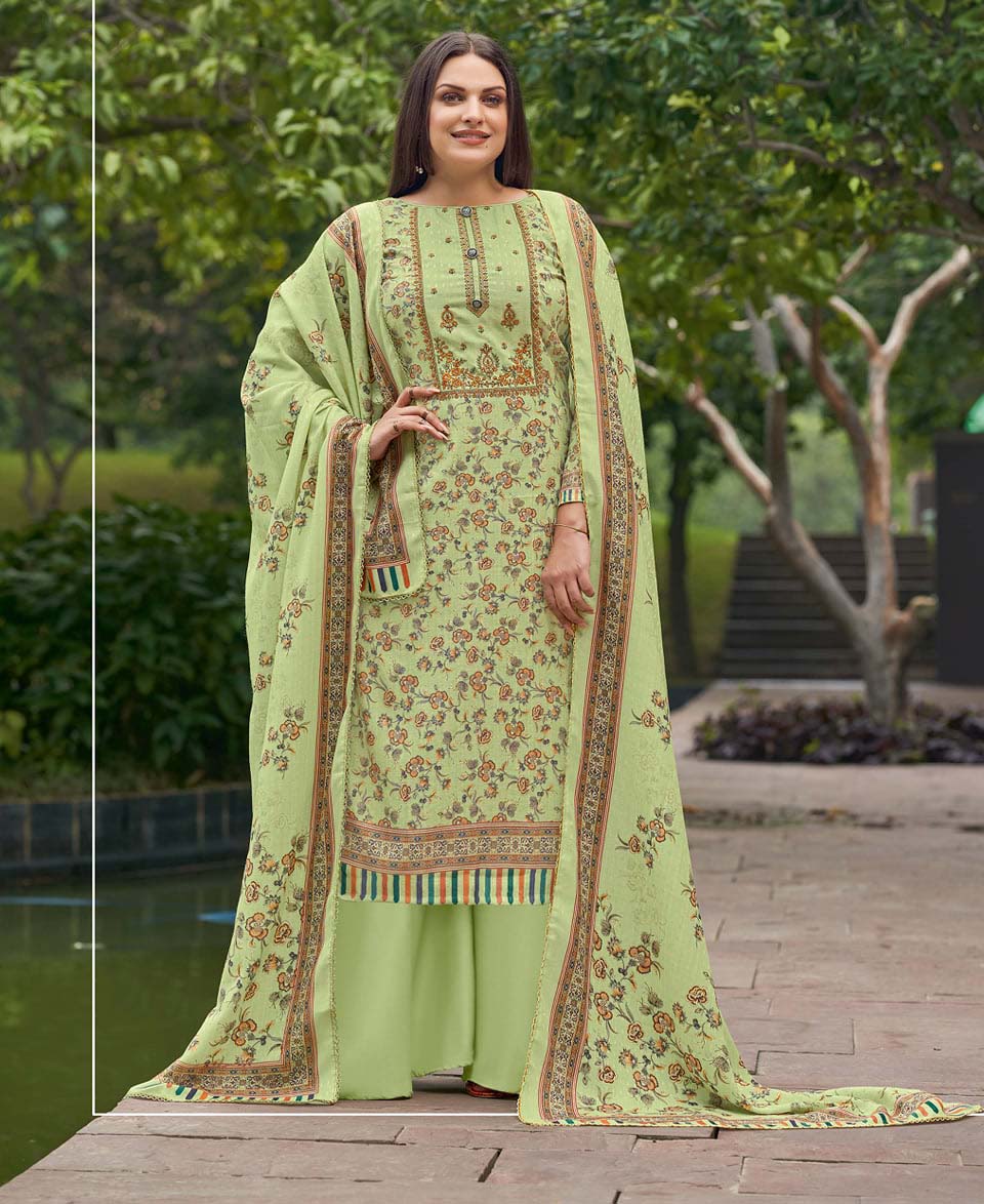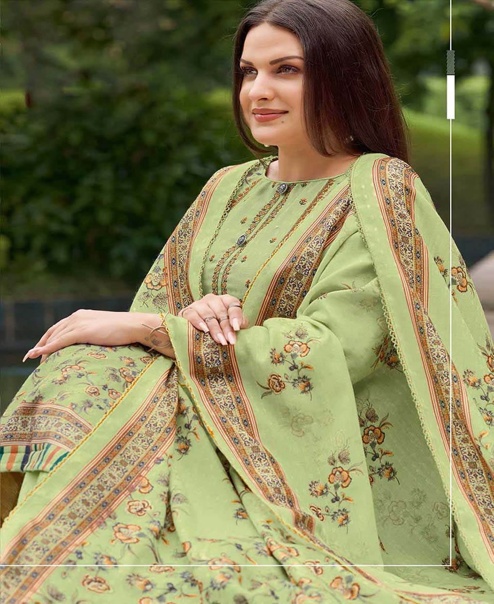 Unstitched Printed Women Green Cotton Suits with Embroidery