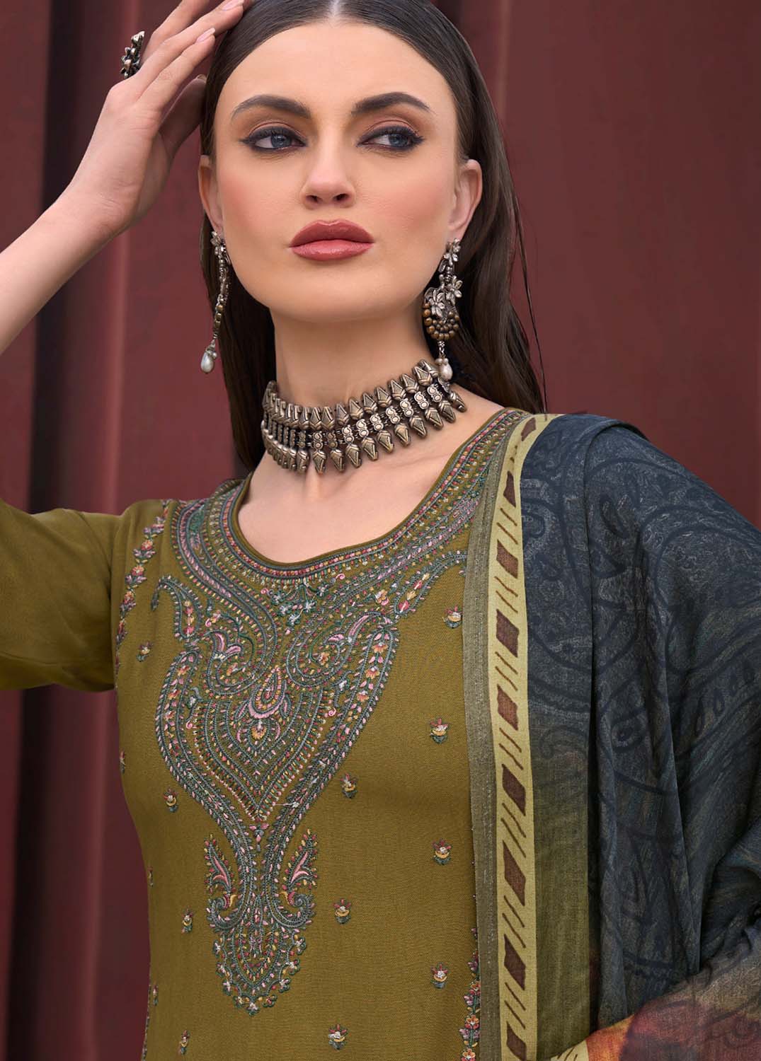 Unstitched Woolen Pashmina Winter Suit Dress Material with Embroidery