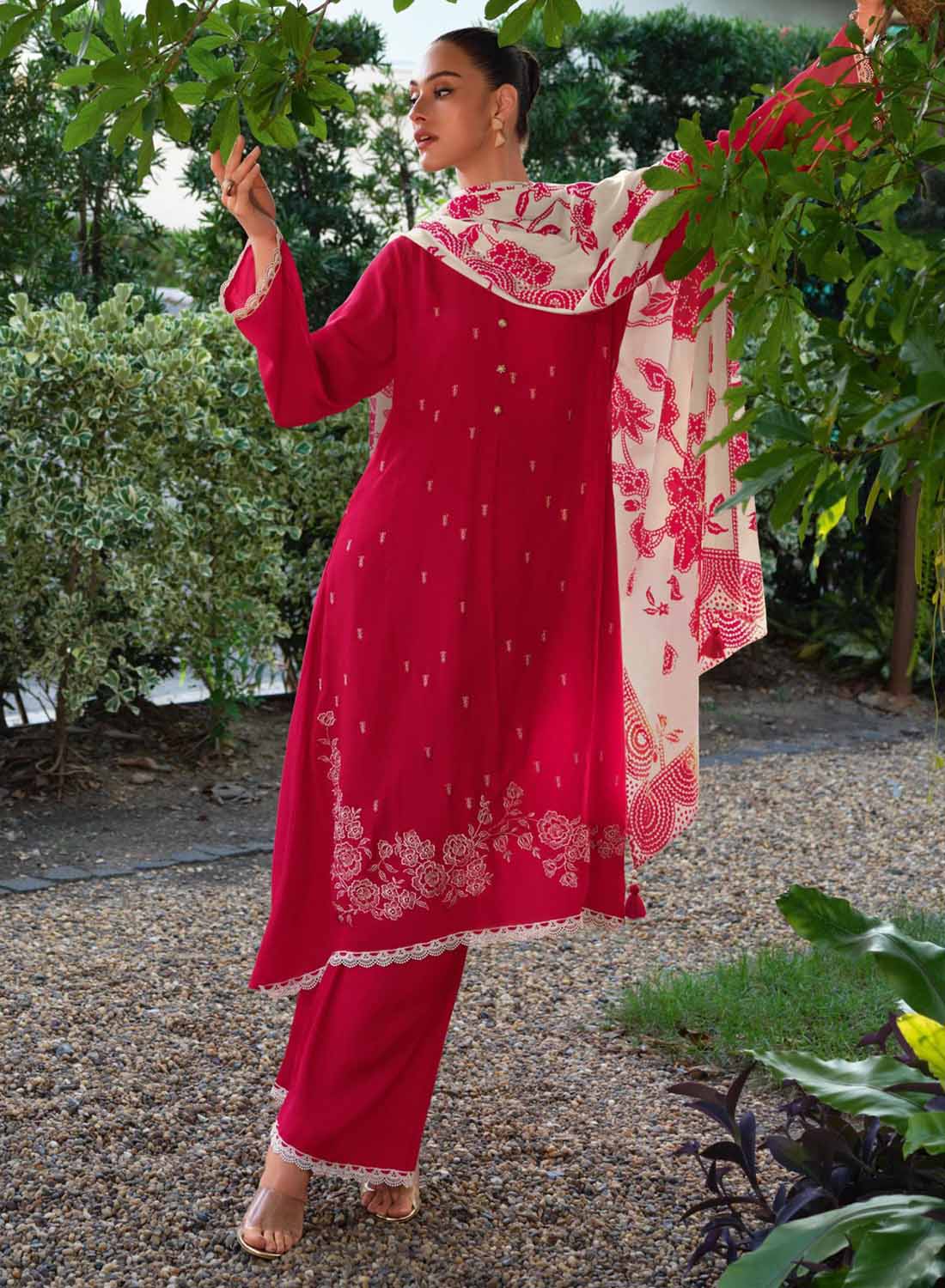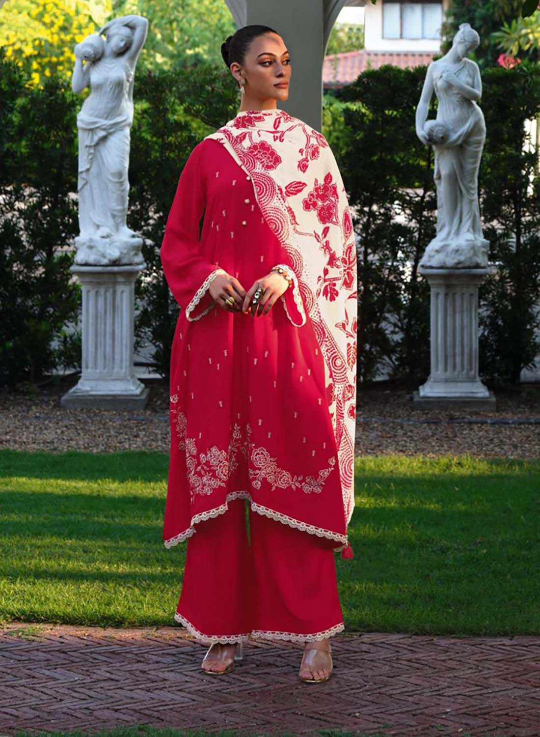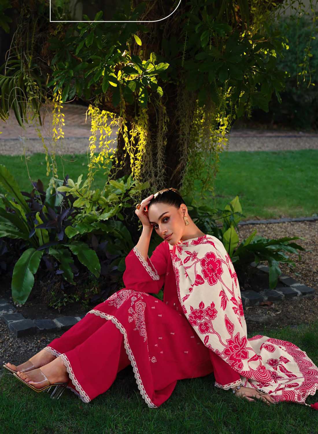 Varsha Red Unstitched Cotton Suit Material with Embroidery and Lace