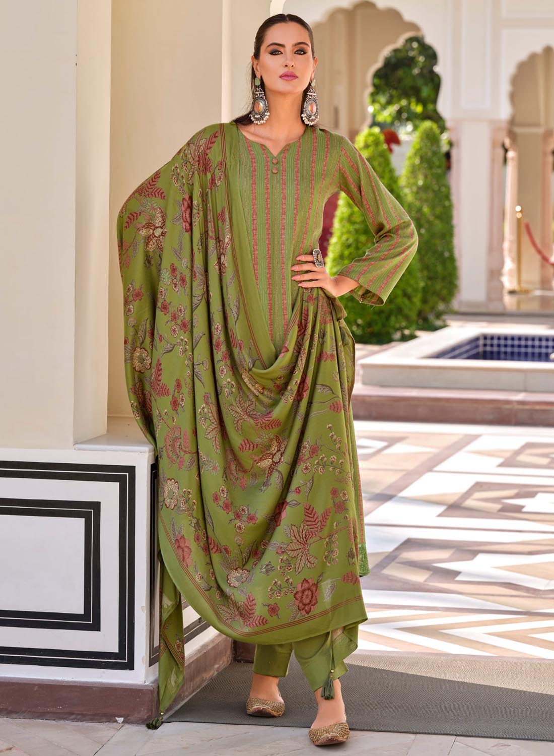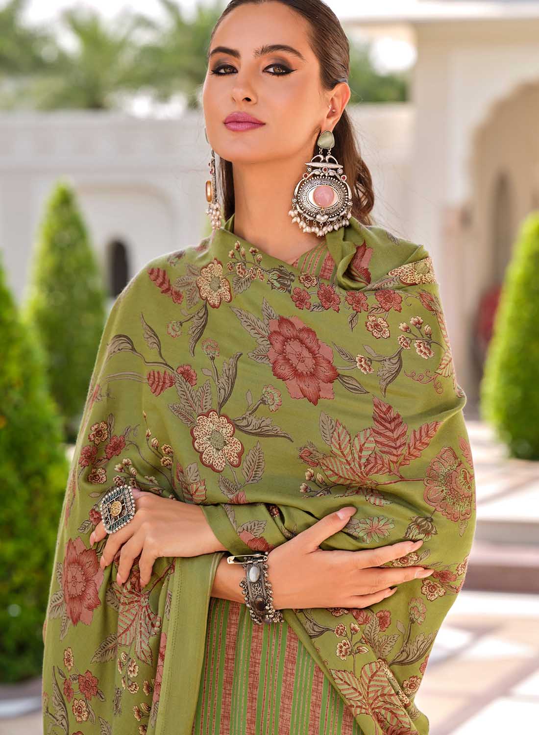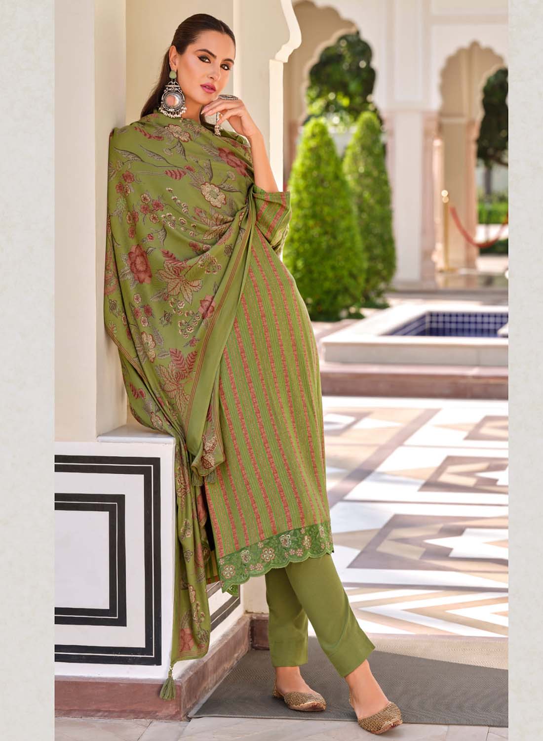 Women Green Unstitched Pashmina Winter Suit Dress Material with Embroidery
