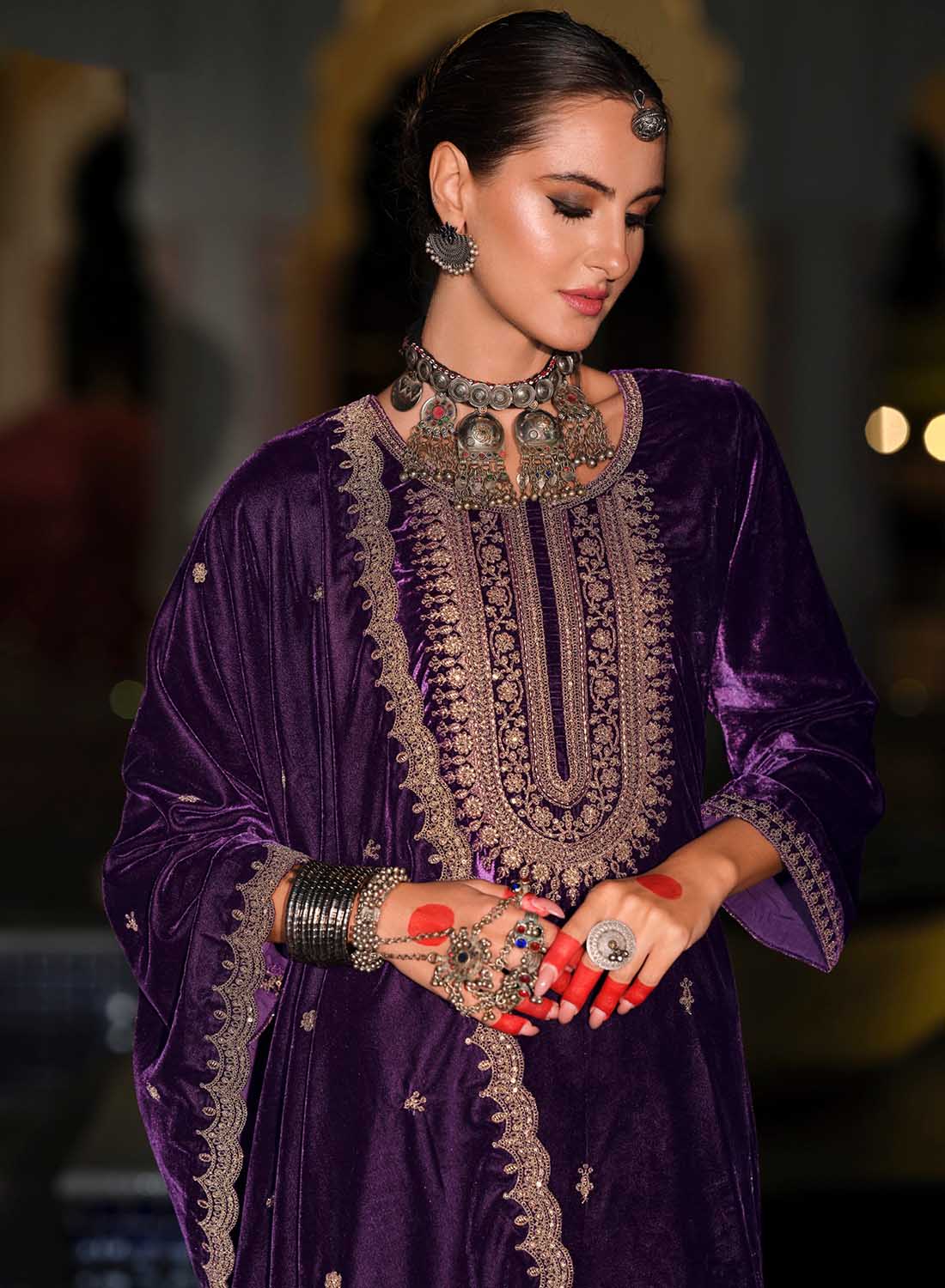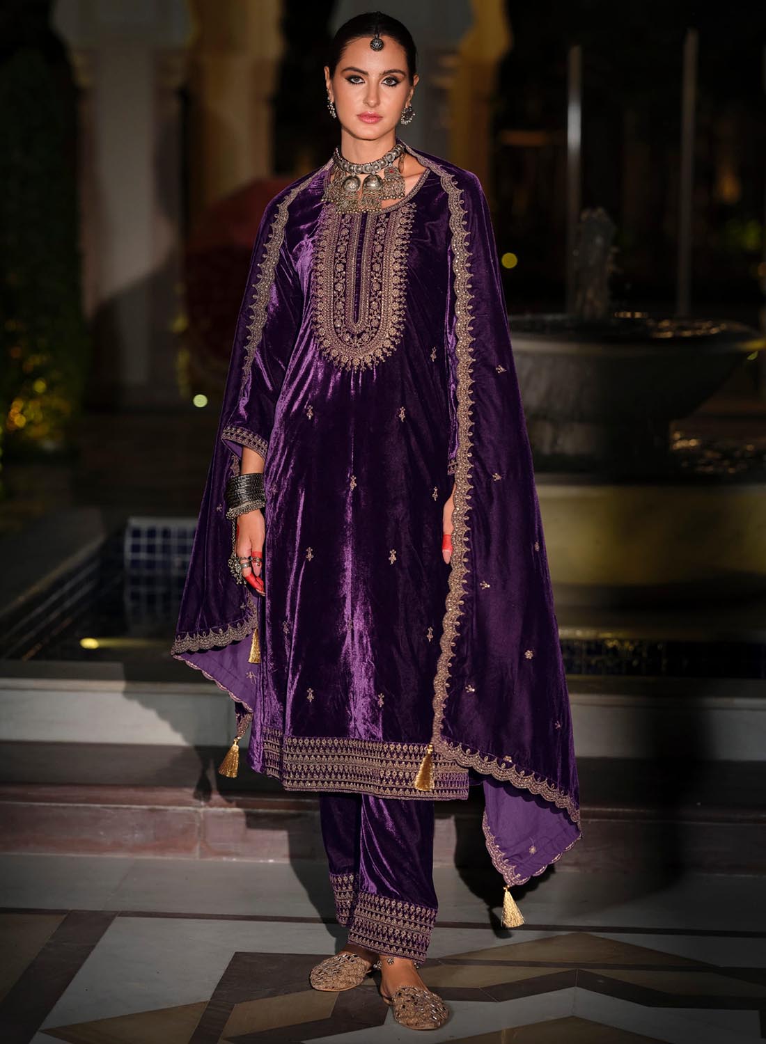 Women Party Wear Unstitched Winter Velvet Suit Dress Material with Embroidery