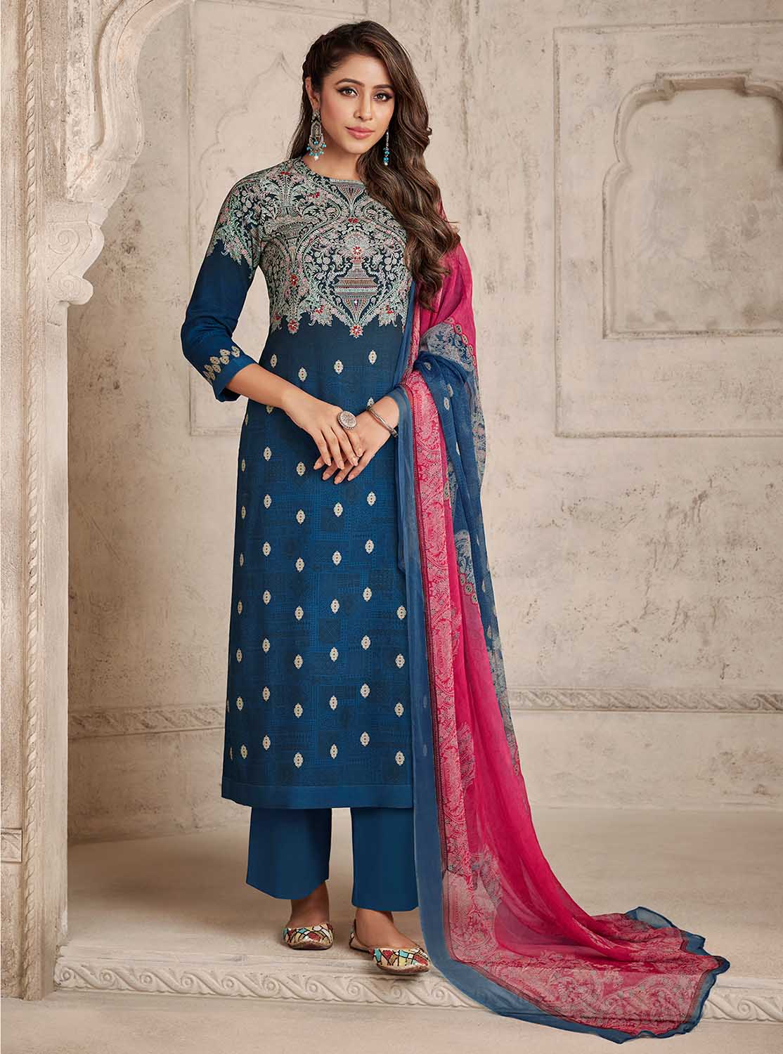 Women's Printed Blue Pashmina Winter Suits Dress Materials