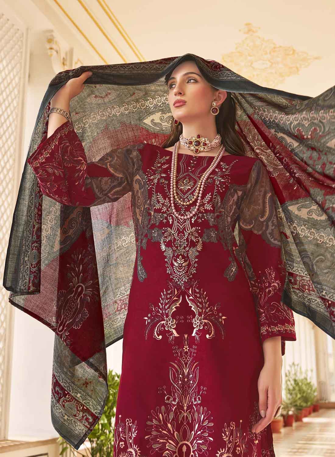 Women's Red Pakistani Print Unstitched Cotton Suit Dress Material