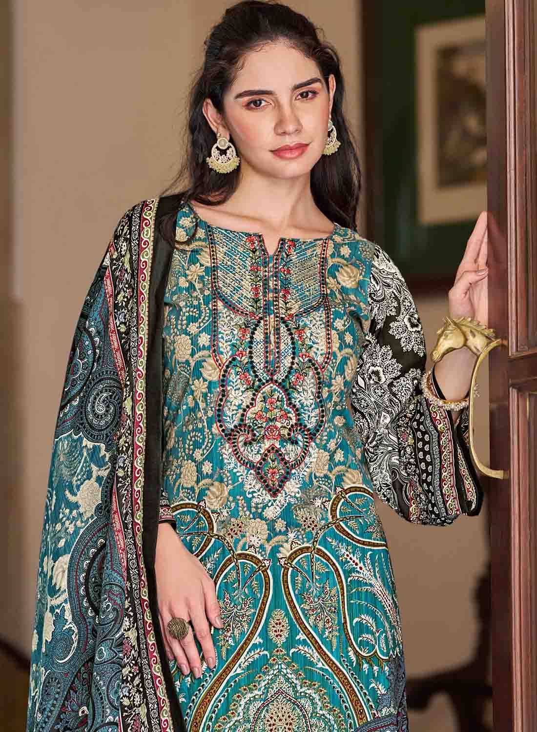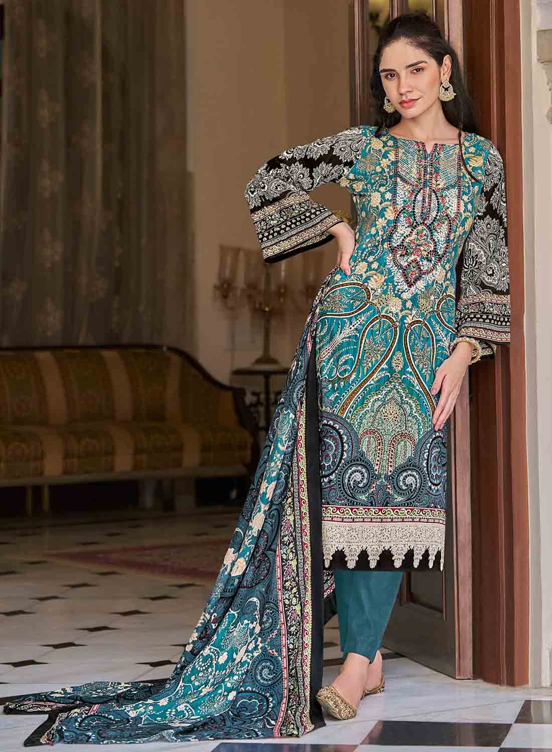 Women's Teal Pakistani Print Unstitched Cotton Suit Dress Material