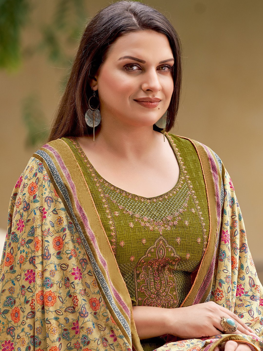 Green Woolen Pashmina Winter Unstitched suits for Ladies