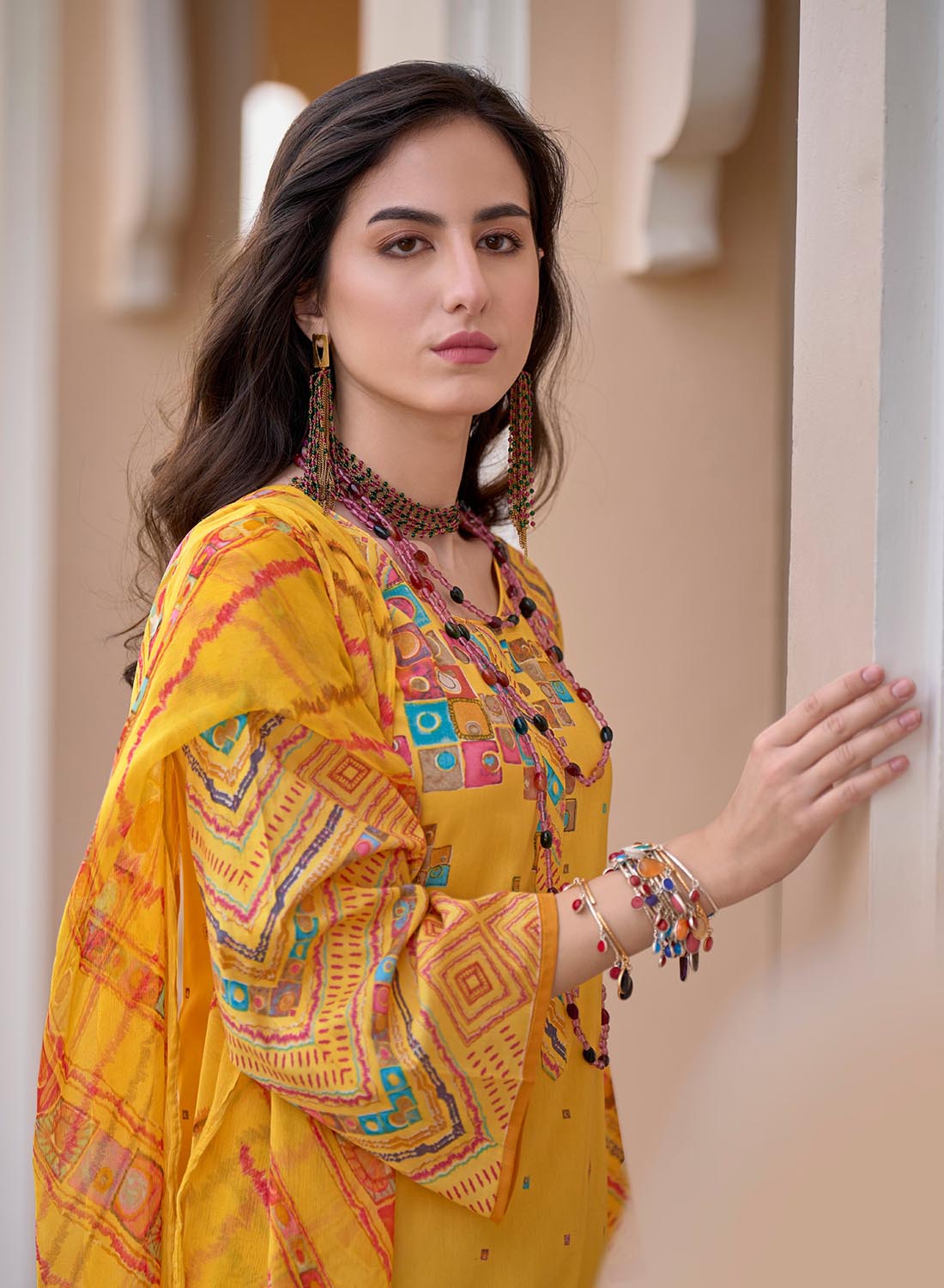 Yellow Pure Lawn Cotton Unstitched Salwar Suit Material with Dupatta